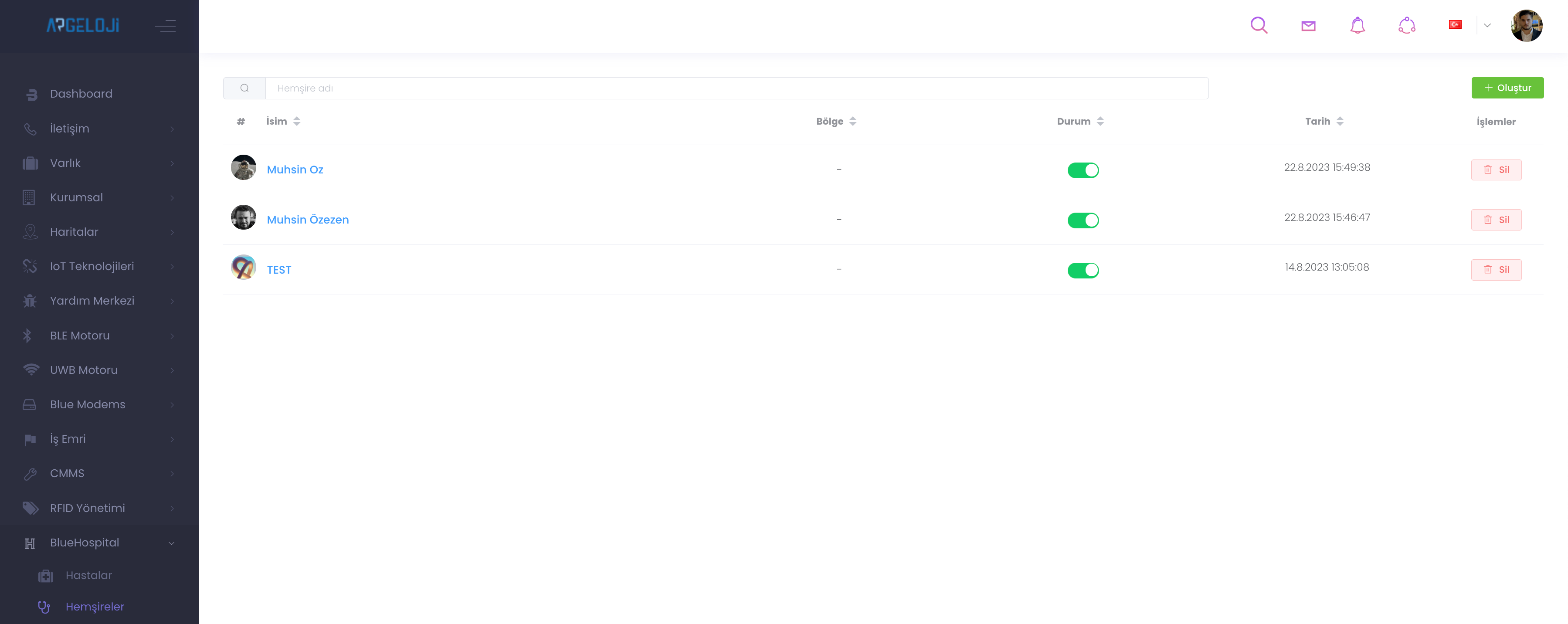 Hemşireler bölümü hastaneye kayıtlı hemşirelerin yönetildiği bölümdür. Yeni bir hemşire kaydetmek isterseniz "Oluştur" butonuna tıklayabilirsiniz.