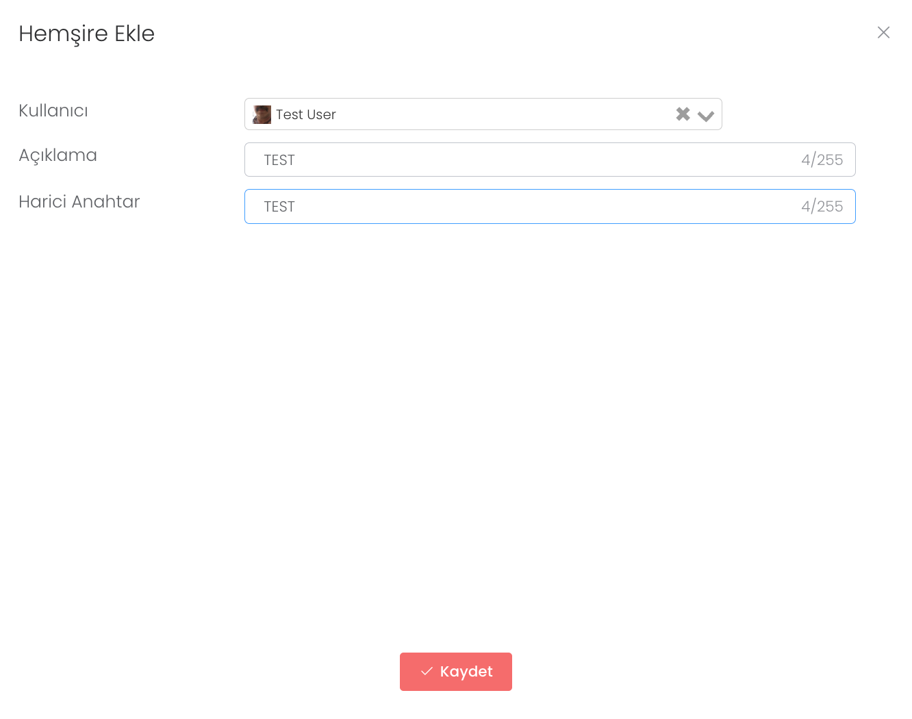 "Oluştur" butonuna tıkladıktan sonra hemşire kullanıcı bilgisini, harici anahtar ve açıklamasını girdikten sonra "Kaydet" butonuna tıkladığınızda kayıt işlemini gerçekleştirebilirsin.