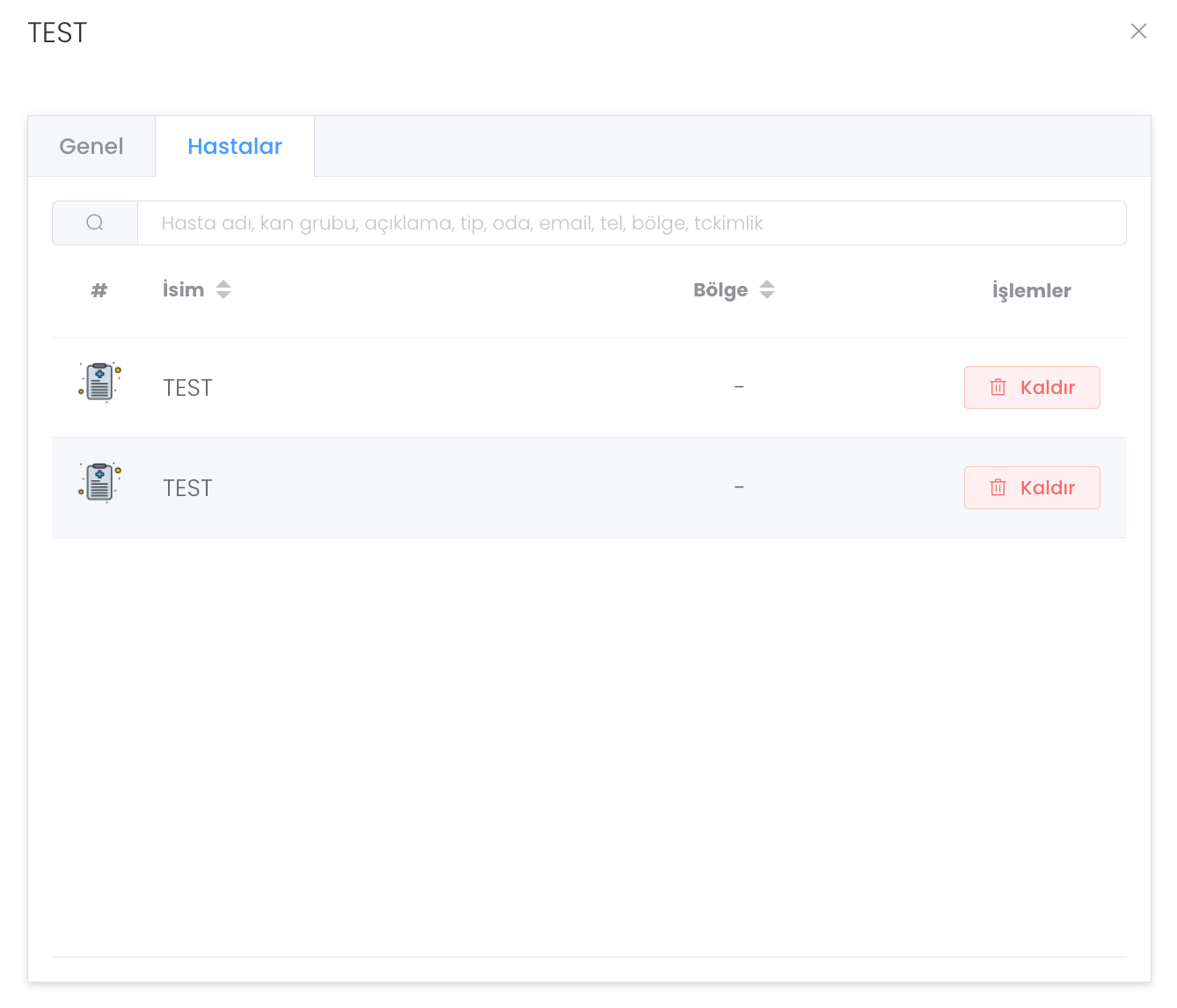 Hastalar bölümü bulunduğunuz hemşirenin sorumluluğunda, kaç adet hasta olduğunu ve hastaların kim olduklarını görebileceğiniz bir yapı açılır.