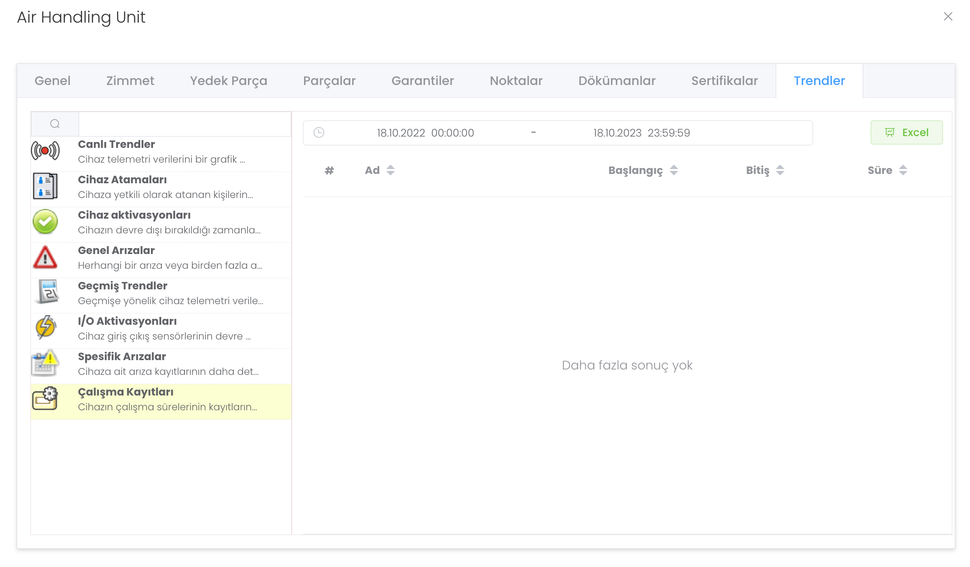 Çalışma Kayıtları : Cihazın çalışma sürelerinin kayıtlarını inceleyebilirsiniz.