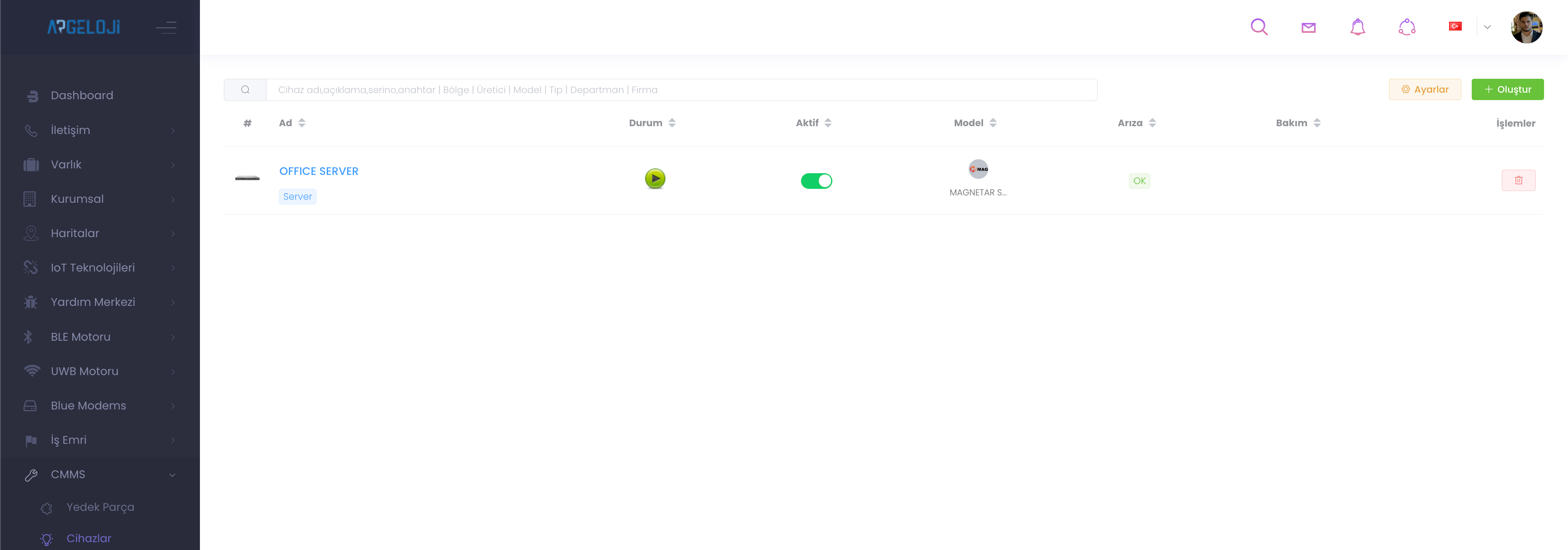 CMMS Cihazların yönetildiği paneldir. "Cihazlar" panelinde tüm cihazların durum, model, aktiflik durumu vb. yönetimini sağladığınız yerdir.