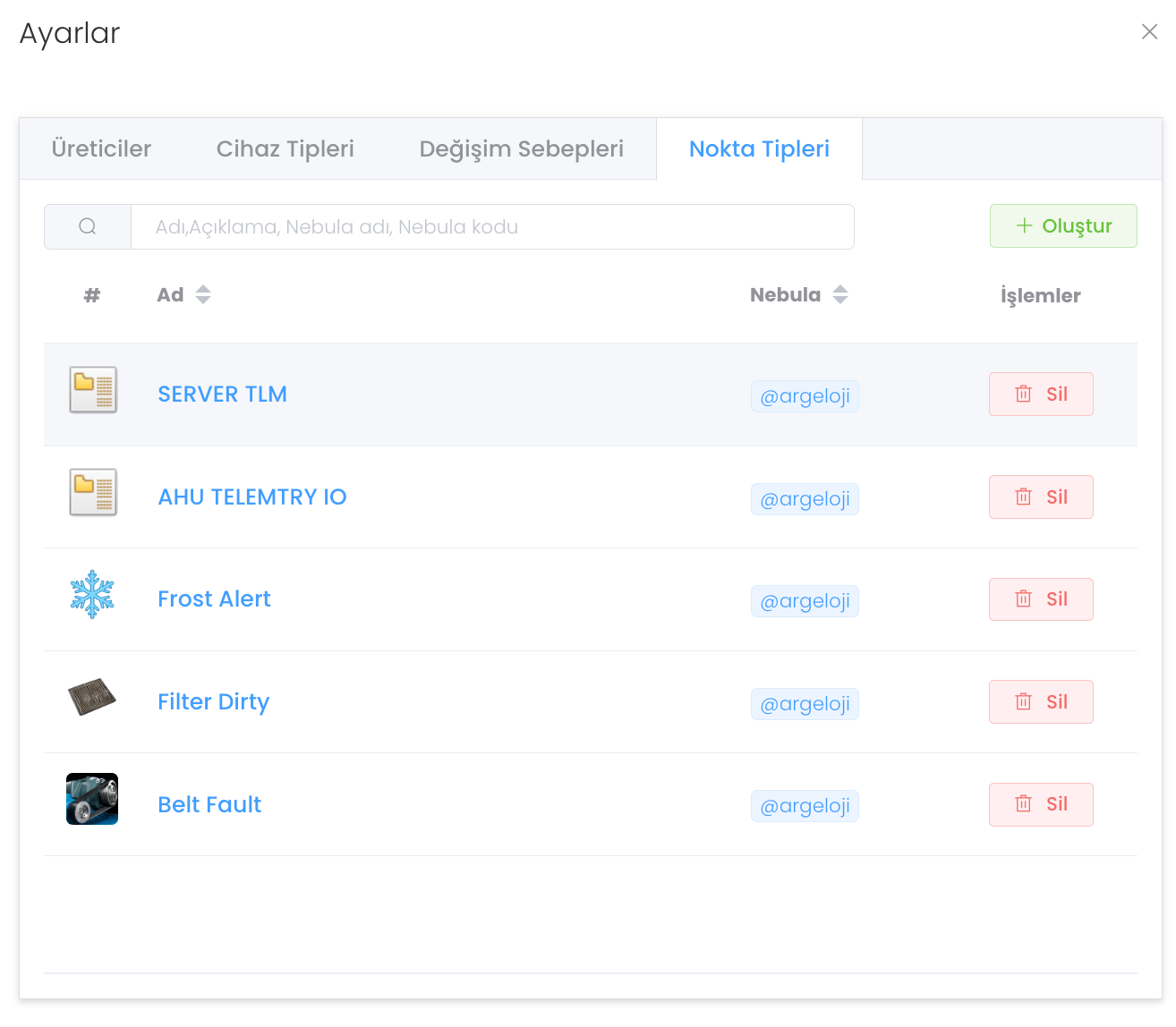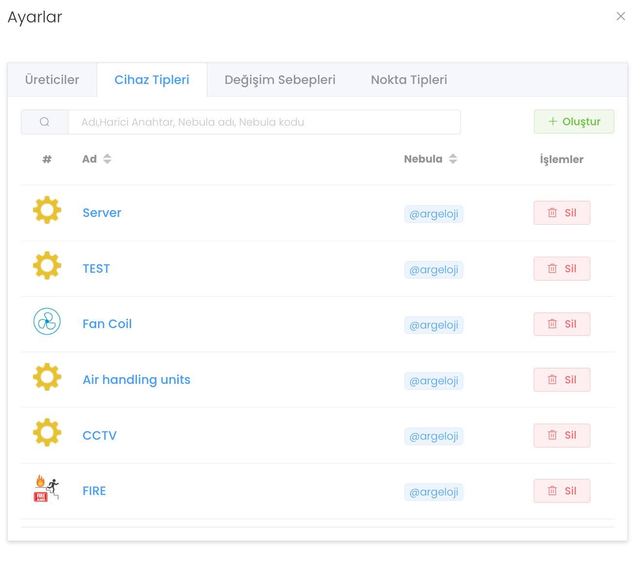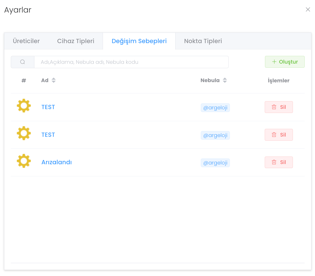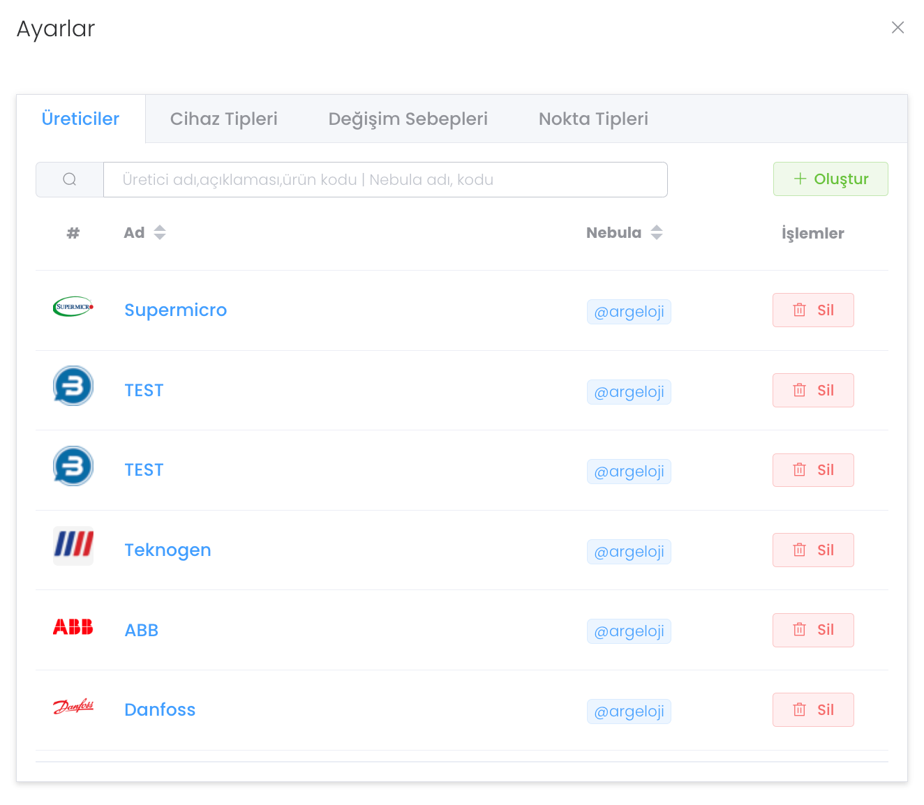 "Ayarlar" butonuna basıldığında Üreticiler - Cihaz Tipleri - Değişim Sebepleri - Nokta Tipleri olmak üzere 4 farklı sekme bulunur. Üreticiler yedek parça kısmında detaylıca anlattığımız gibi üretici oluşturmanızı ve yönetmenizi sağlar.