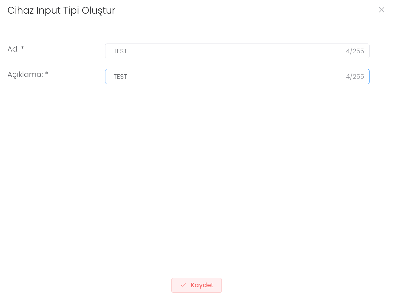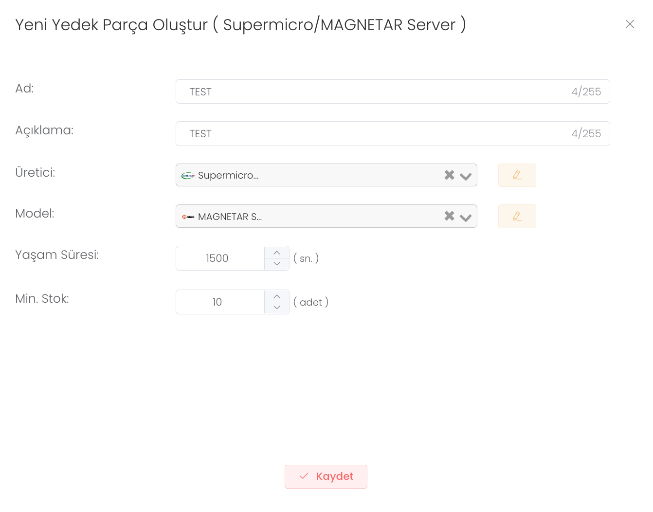 "Oluştur" butonuna bastıktan sonra ad ve açıklama, üretici, model, yaşam süresi ve minimum stok durumu girerek yeni bir cihaz yedek parçası oluşturabilirsiniz.