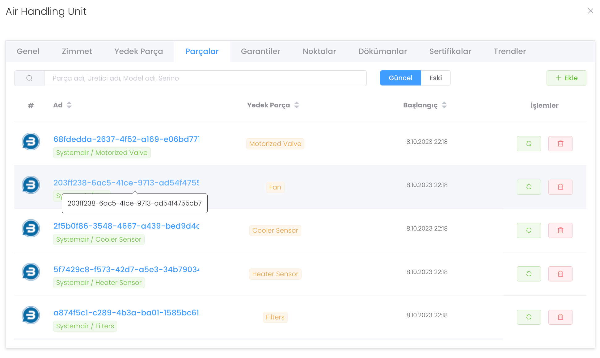 Parçalar paneli elimizde olan parçaların güncel ve eski durumları dahil olmak üzere yönetimini sağladığımız, sil butonu yanında bulunan "yeşil buton" ile değişimini sağladığımız, "Ekle" butonu ile yeni parça eklediğimiz bir yapıdır.