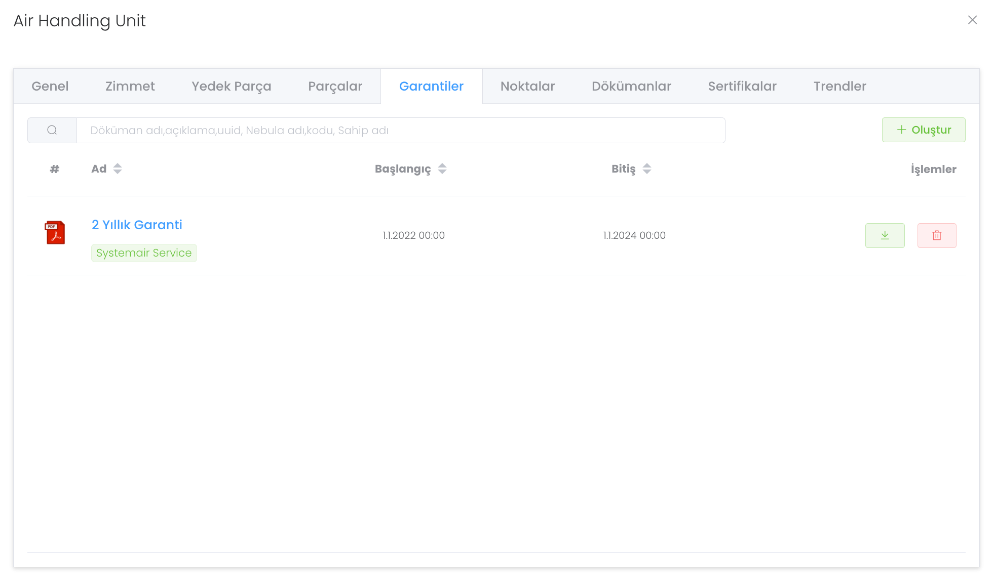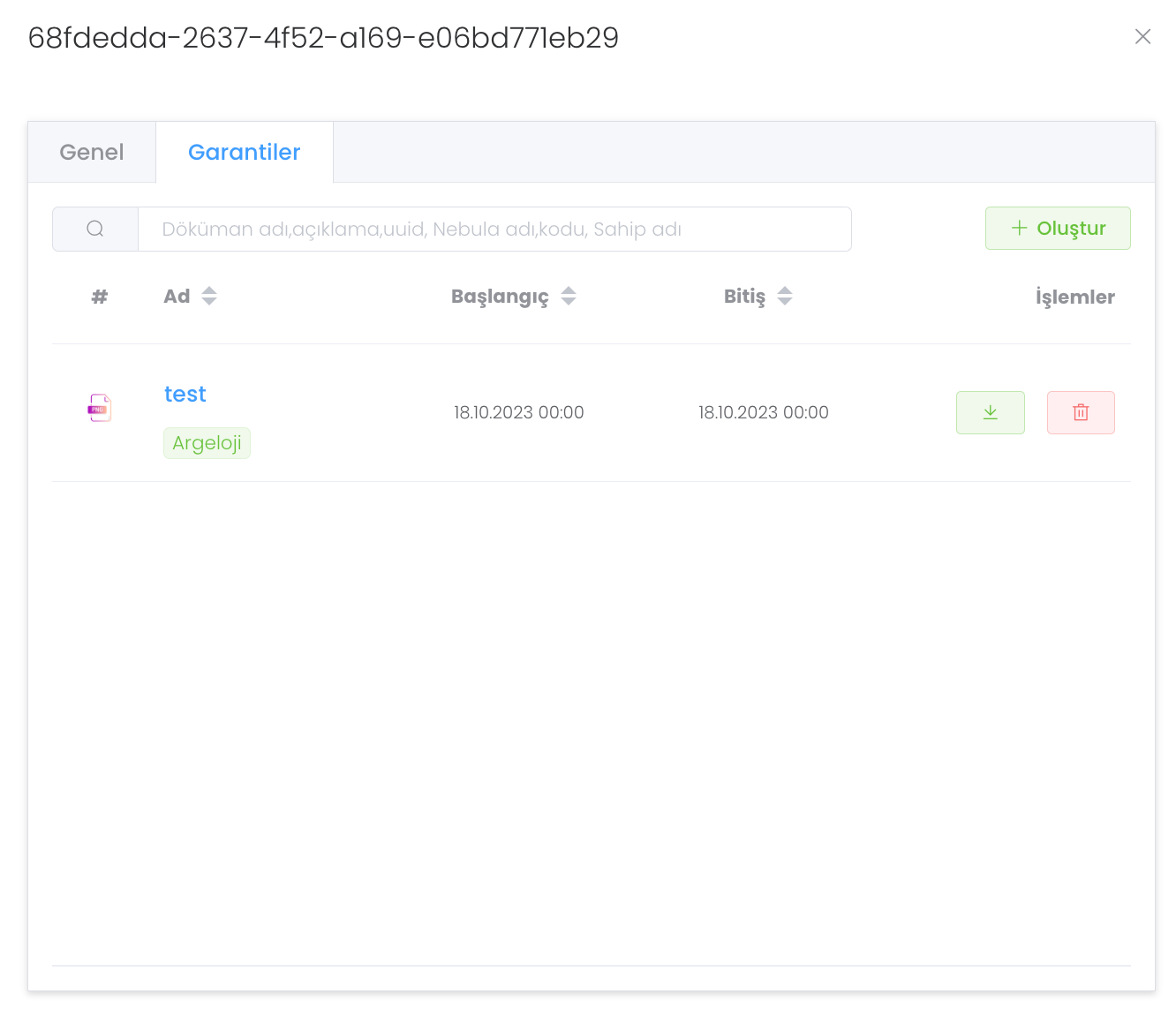 "Garantiler" bölümünde cihazın garantilerini görebileceğiniz, yönetebileceğiniz ve gerektiğinde indirebileceğiniz yapıdır. "Oluştur" butonu ile yeni garanti oluşturabilirisiniz.