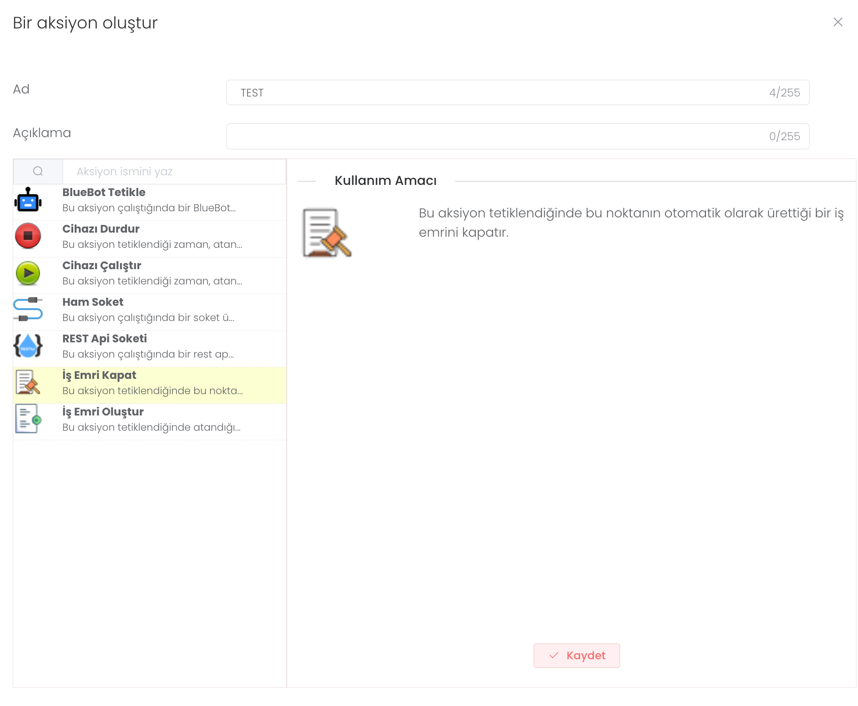 İş Emri Kapat: Bu aksiyon tetiklendiğinde bu noktanın otomatik olarak ürettiği bir iş emrini kapatır.