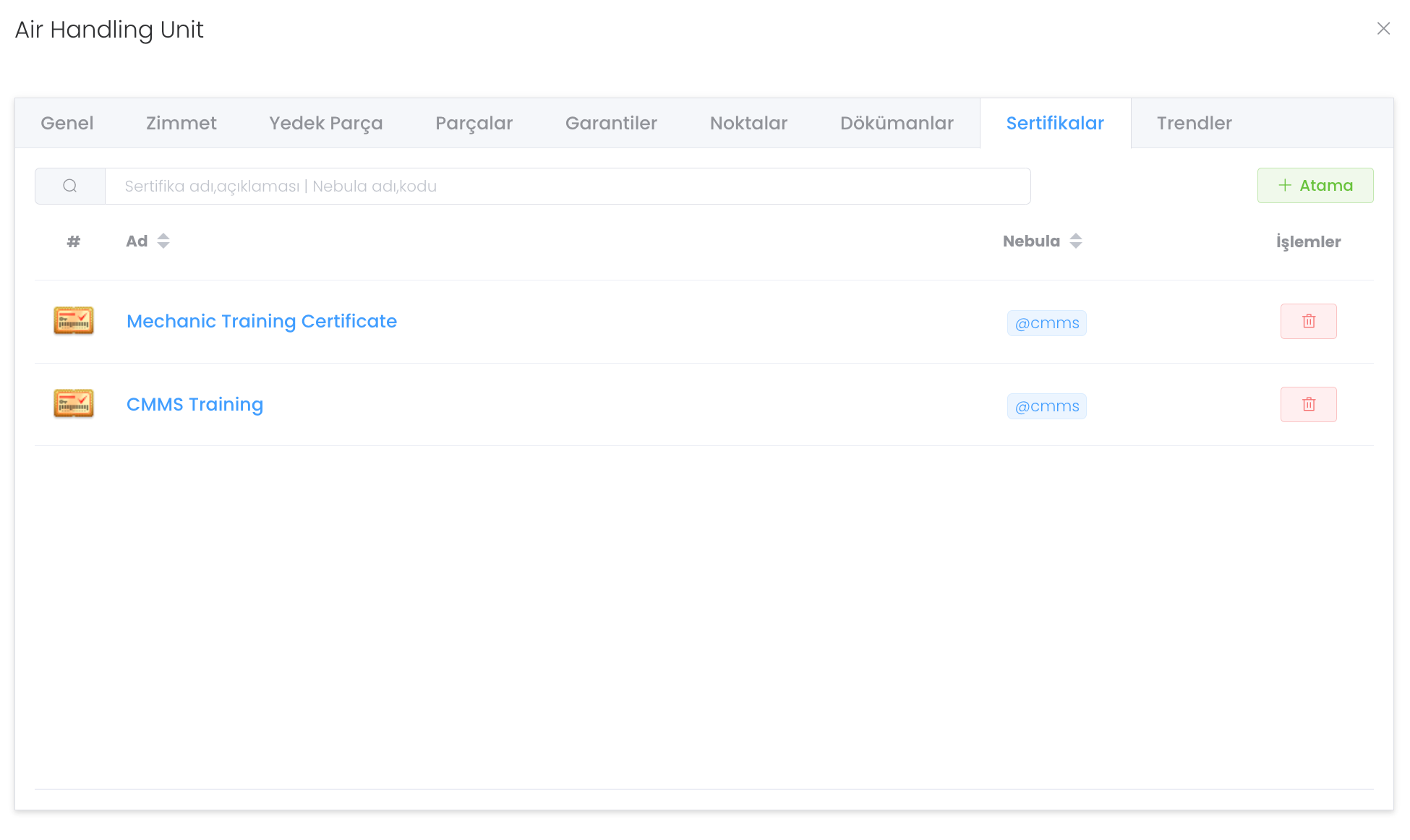 "Sertifikalar" bölümünde cihazın noktalarını görebileceğiniz, yönetebileceğiniz ve gerektiğinde silebileceğiniz yapıdır. "Atama" butonu ile yeni döküman oluşturabilirisiniz.