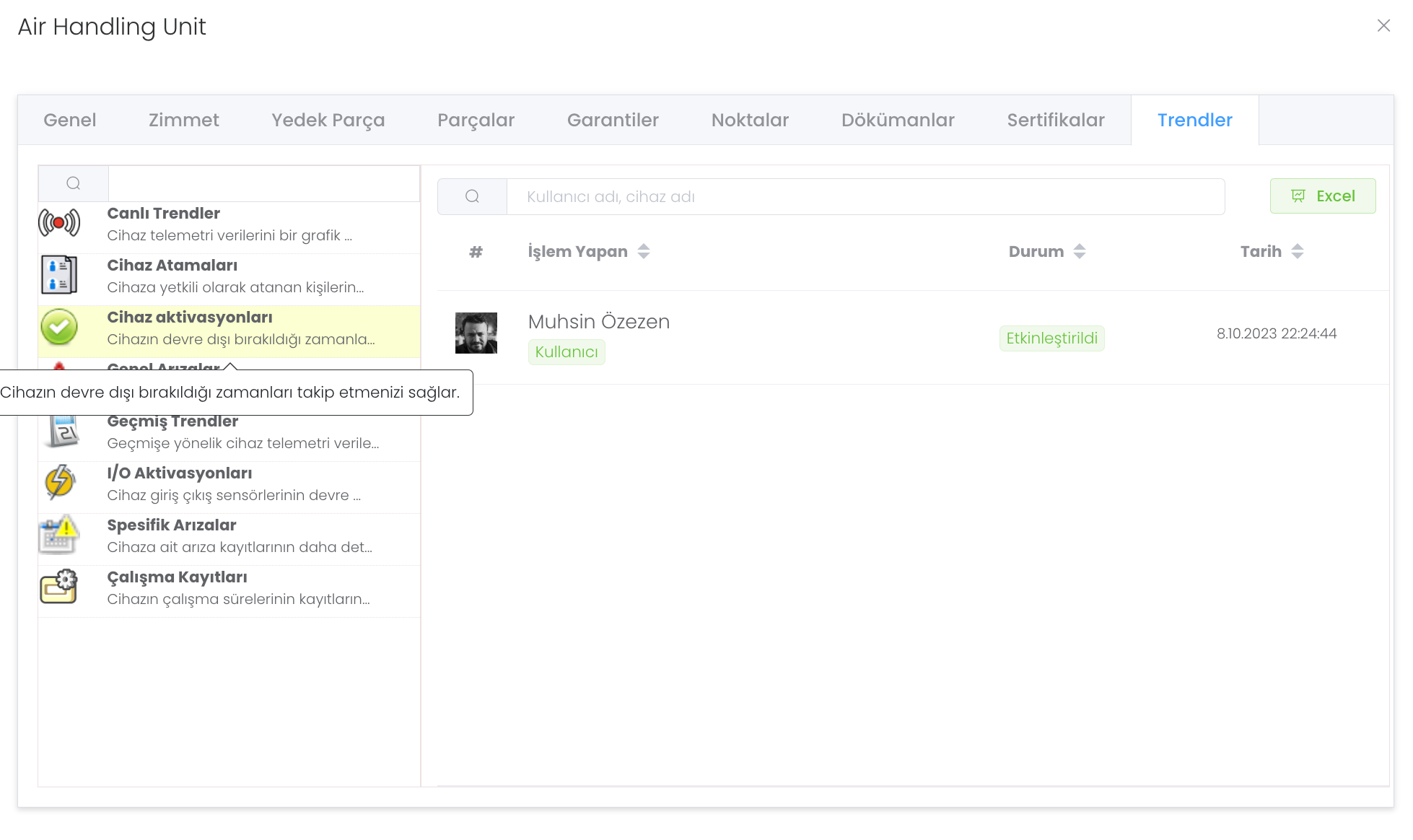 Cihaz Aktivasyonları : Cihazın devre dışı bırakıldığı zamanları takip etmenizi sağlar.