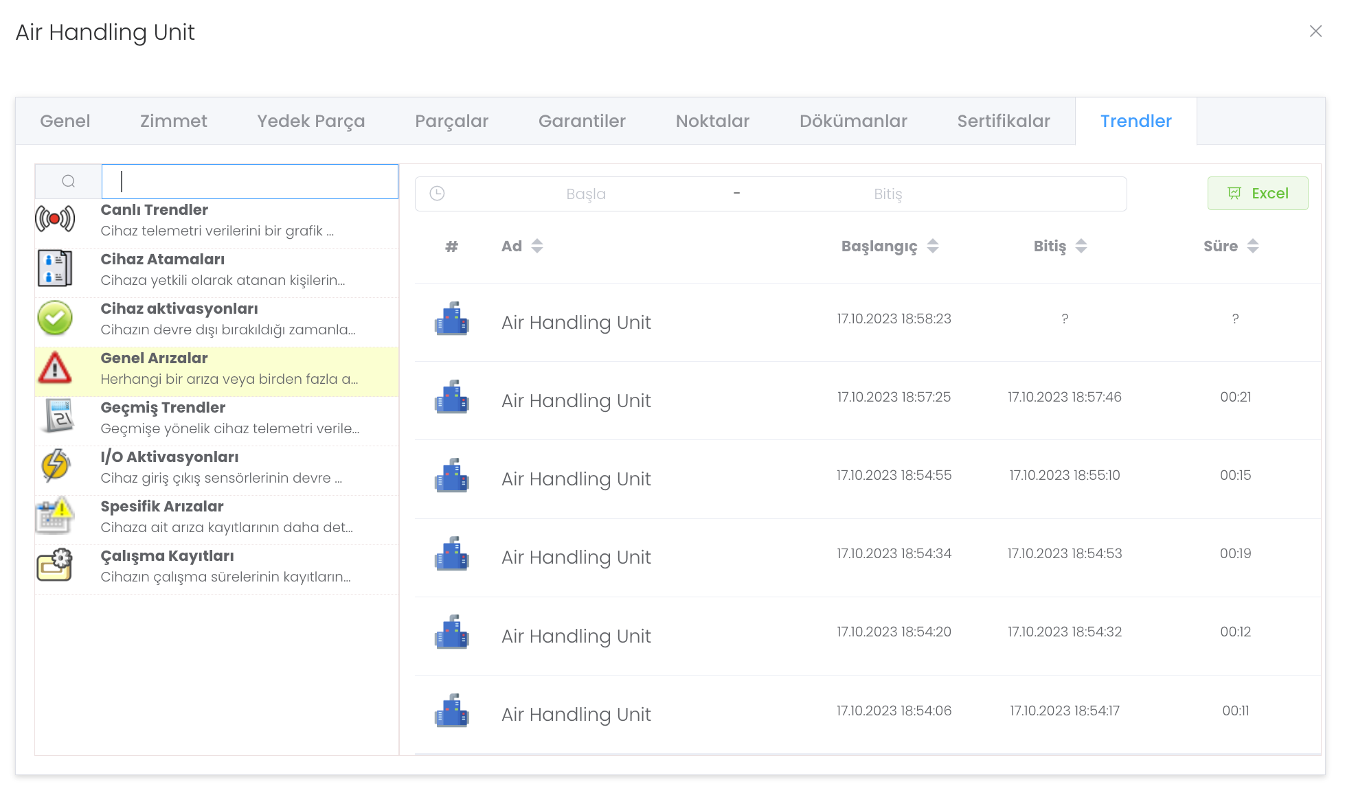 Genel Arıza : Herhangi bir arıza veya birden fazla arıza nedeniyle cihazın hatalı olarak çalışma sürelerini gösterir.
