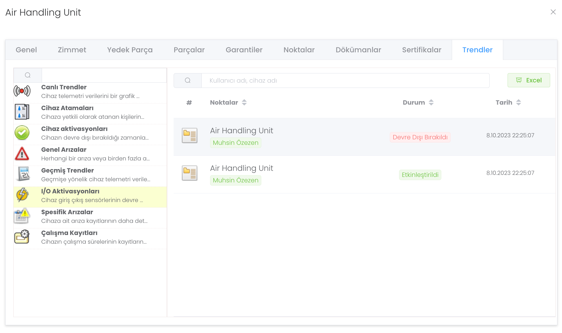 I/O Aktivasyonları : Cihaz giriş çıkış sensörlerinin devre dışı bırakıldığı zamanları bulmanıza yardımcı olur.