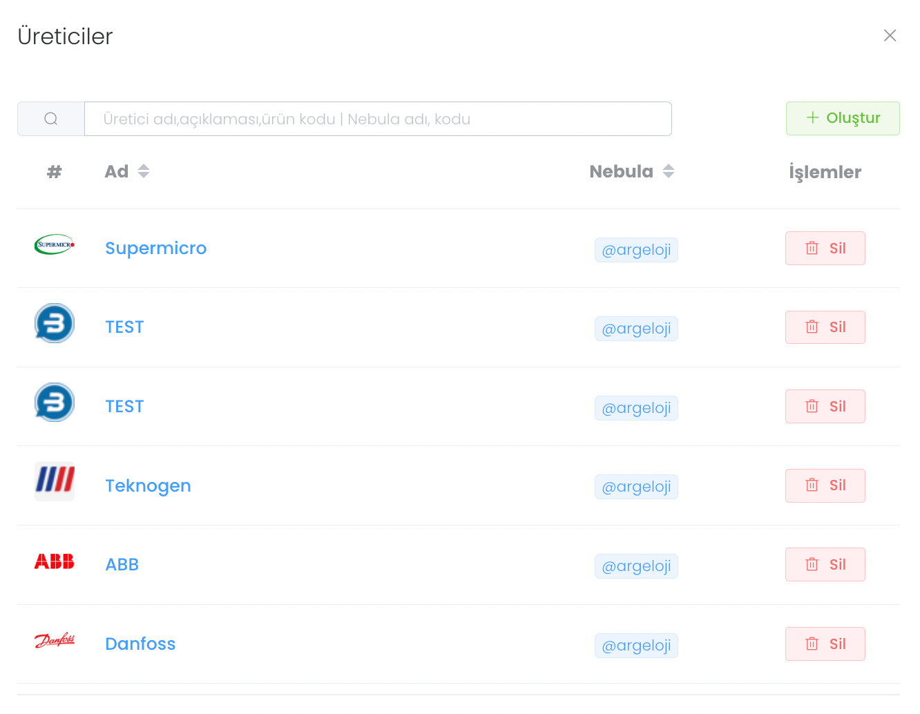 "Üreticiler" bölümünden yedek parçaların üreticilerinin seçimini yaptığınız alandır. Yeni bir üretici eklemek istiyorsanız "Oluştur" butonuna tıklayınız.