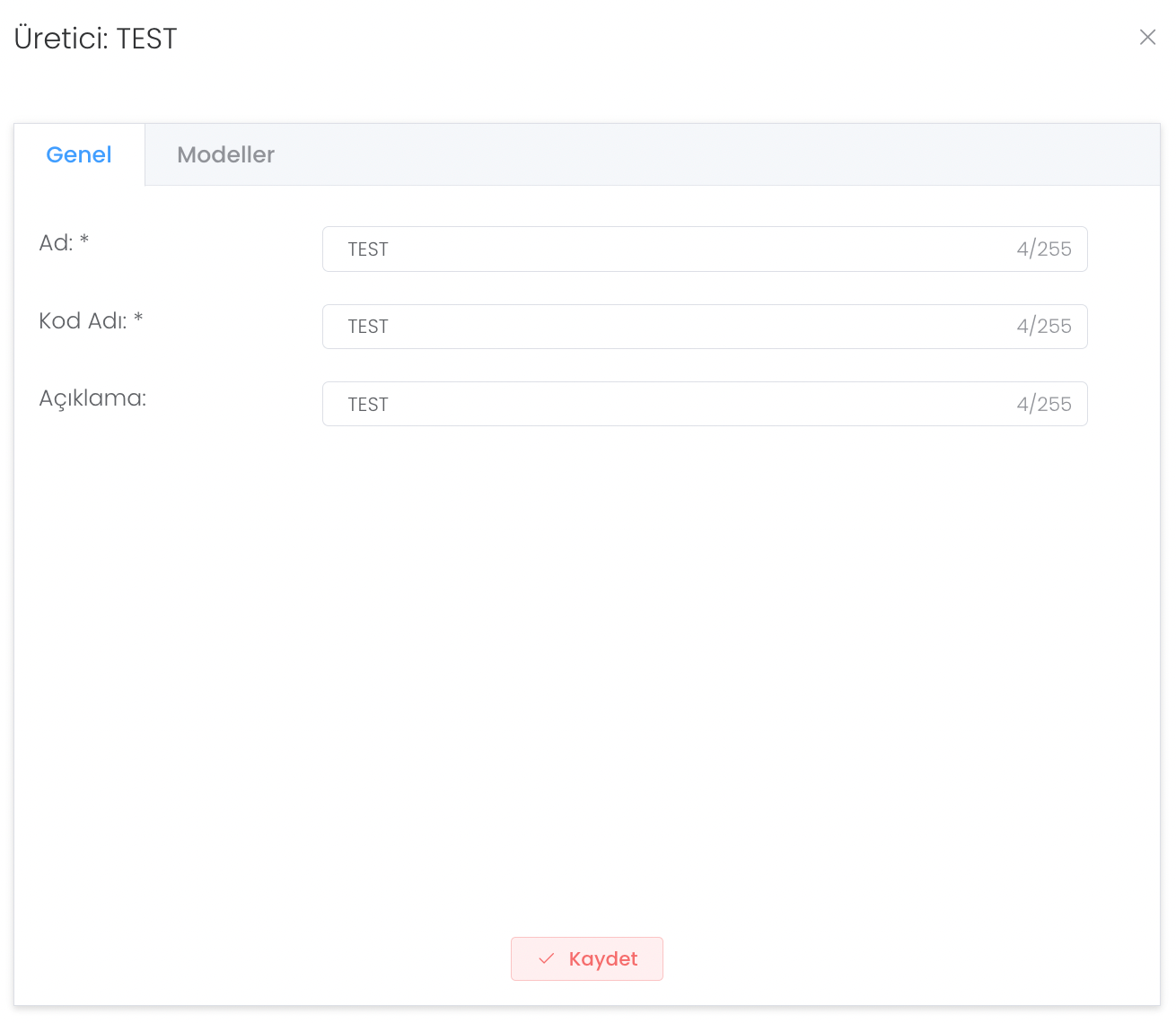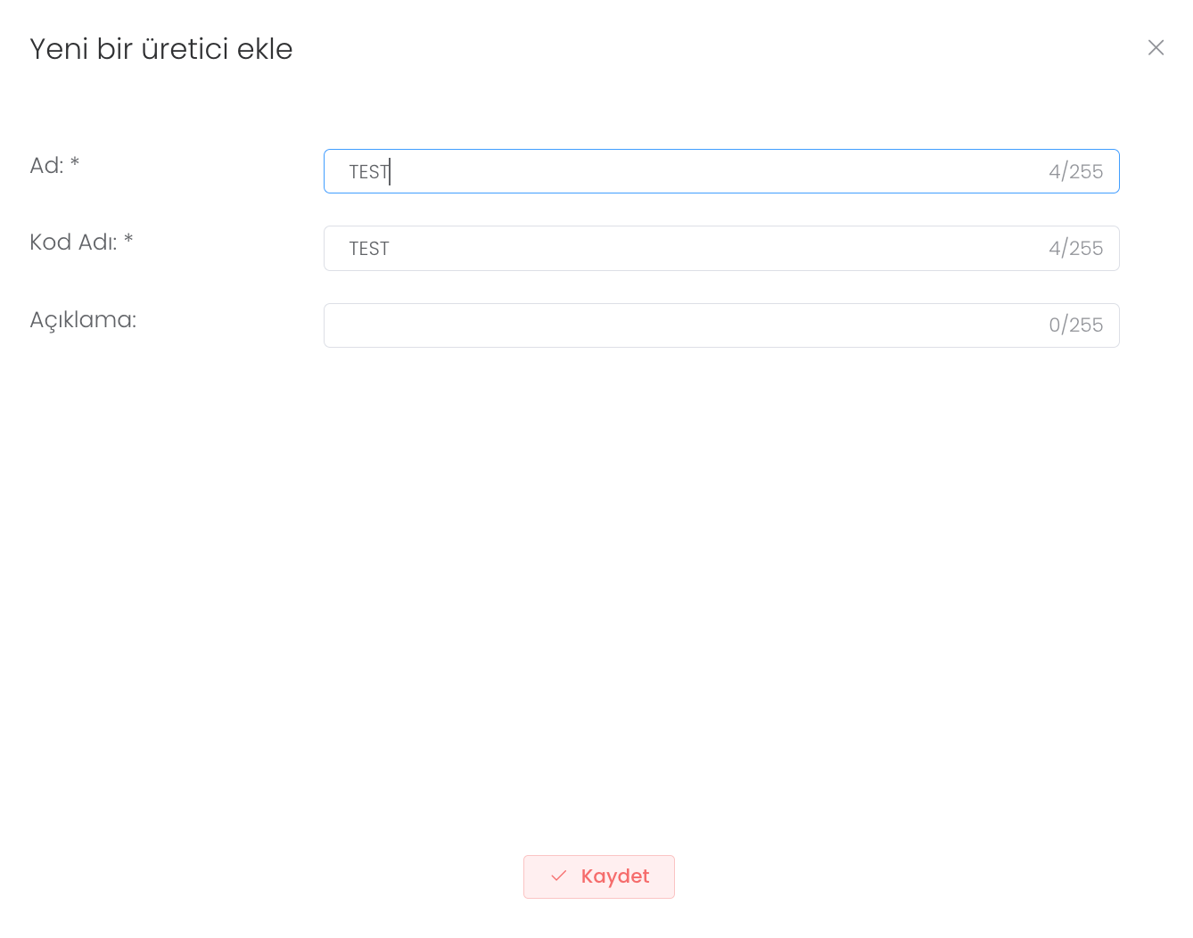 "Oluştur" butonuna tıkladıktan sonra ad, kod adı gibi bilgileri girip yeni üreticinizi oluşturabilirsiniz.