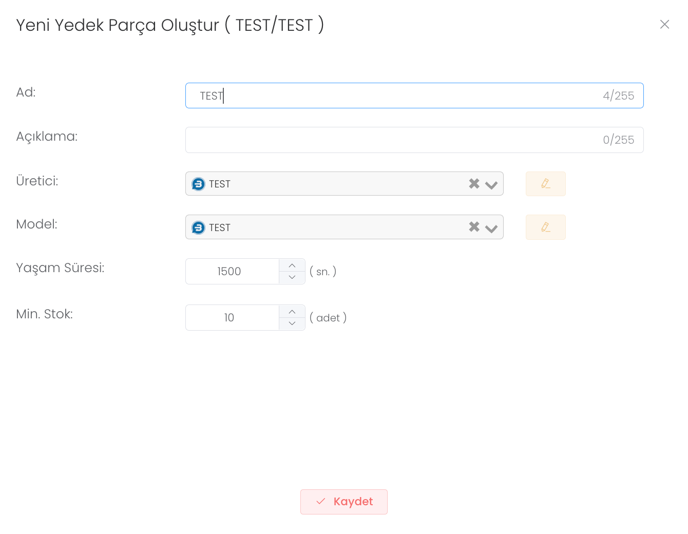 "Oluştur" butonuna bastığınızda yeni yedek parça oluşturmanız için size bir alan sunulur. Bu alana ad, açıklama, üretici bilgisi, model, yaşam süresi, minimum stok durumunu girdikten sonra "Kaydet" butonuna basınız. Yeni yedek parça oluşturdunuz.
