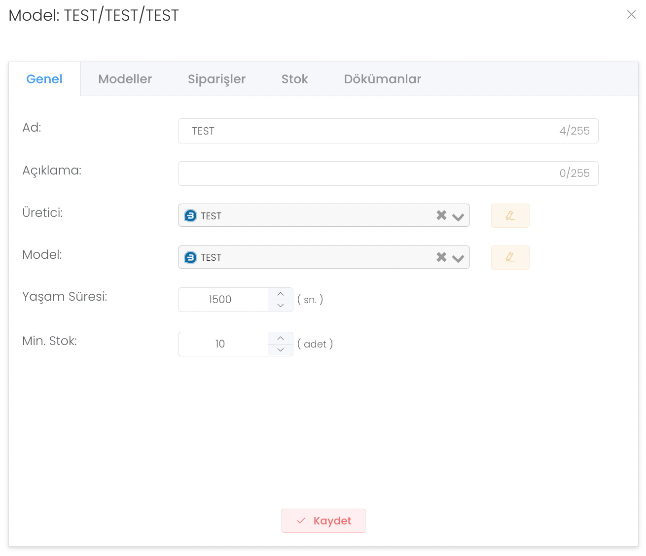 Modeller bölümünde eklediğimiz "Test" modelimizin üstüne tıkladığımızda bize yeni bir panel açılır ve detaylı bilgileri burada gireriz.