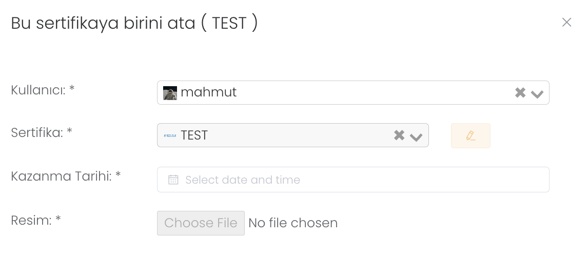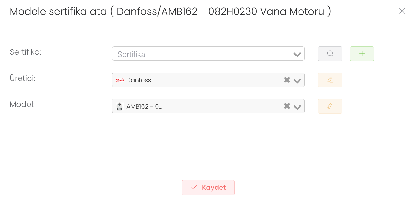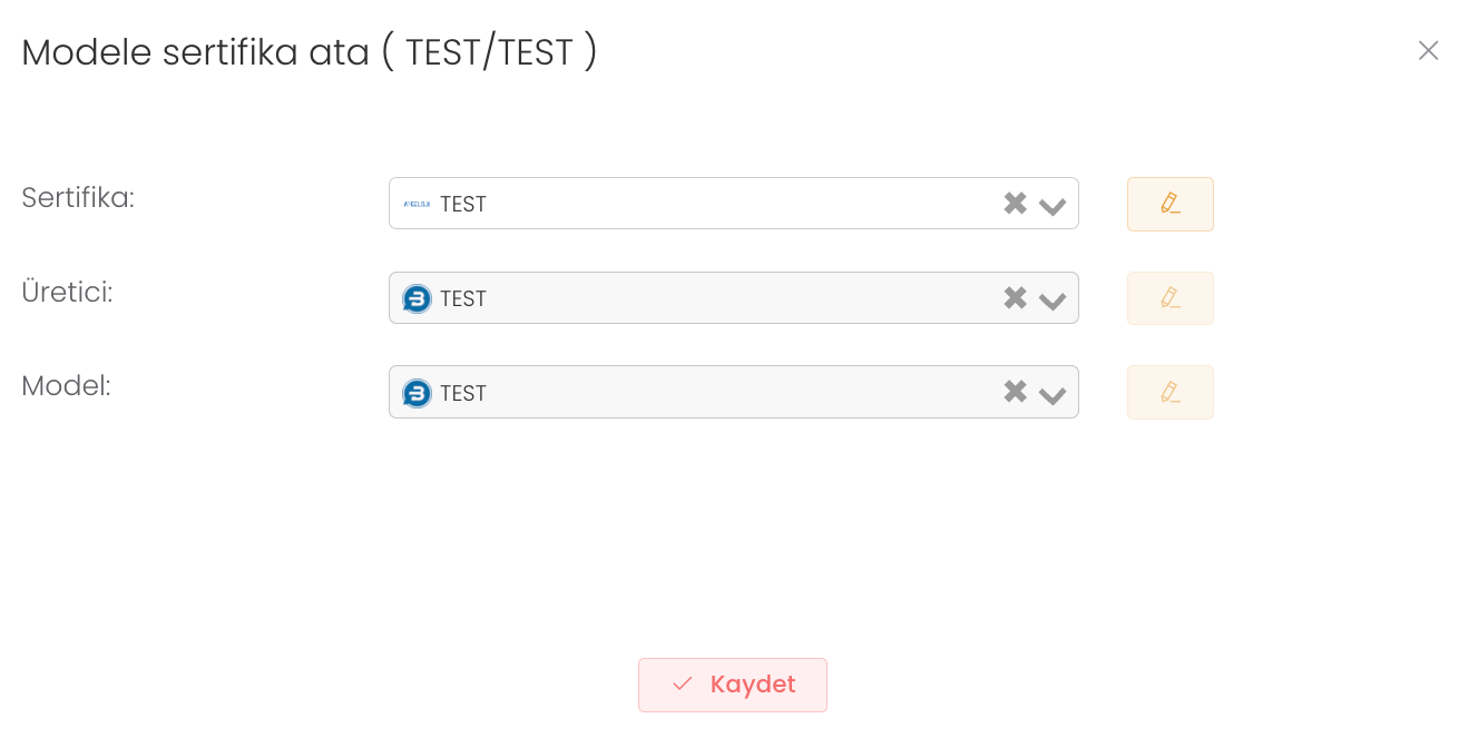 "Atama" butonuna tıkladıktan sonra sertifika, üretici ve model bilgisi girip "Kaydet" butonuna basmanız yeterli . Böylece yeni sertifika atamış olursunuz.