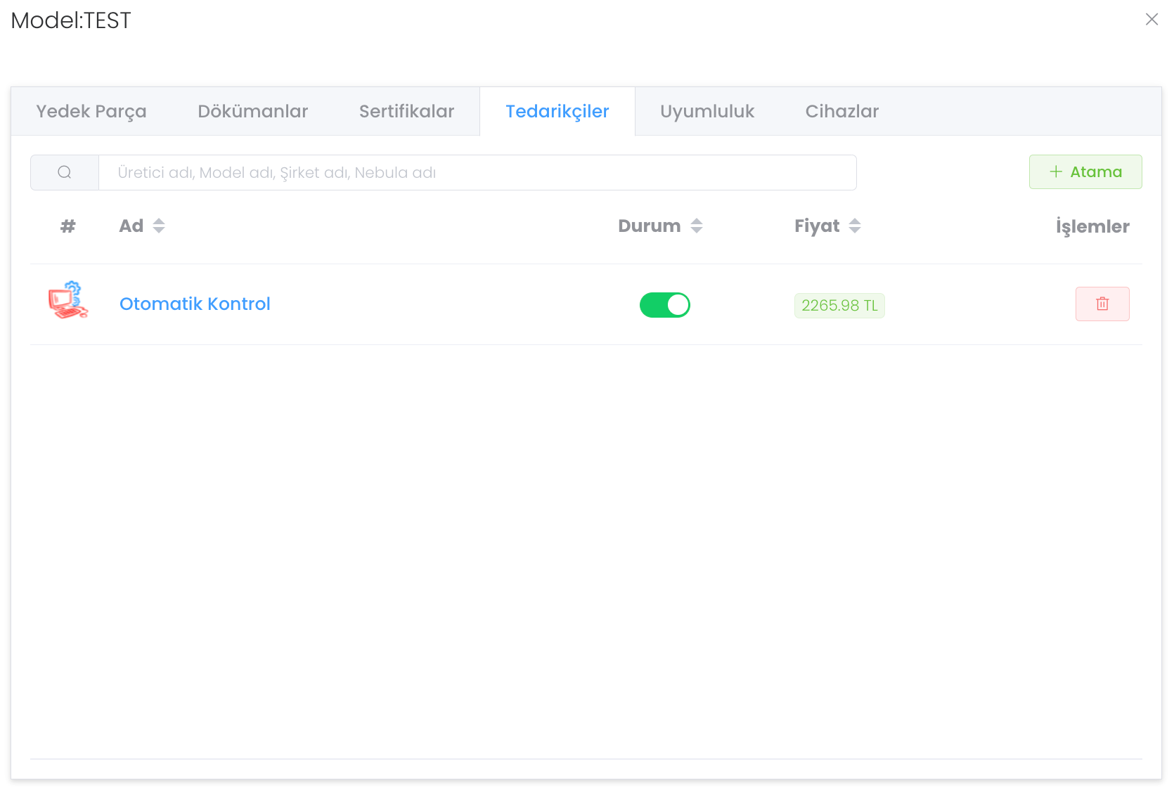 "Tedarikçiler" bölümünde modele atanmış tedarikçileri görür ve yönetirsiniz. Modele yeni tedarikçi atamak için ise "Atama" butonuna tıklayınız.