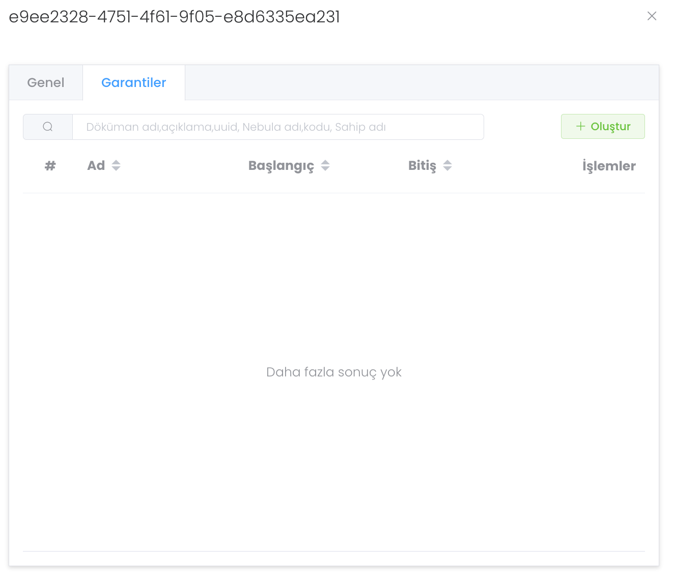 "Yedek Parça" bölümünde modelinize tanımlı yedek parçaları görürsünüz. Eğer bir tanımlama yoksa "Oluştur" butonuna basarak yeni bir yedek parça oluşturabilirsiniz.