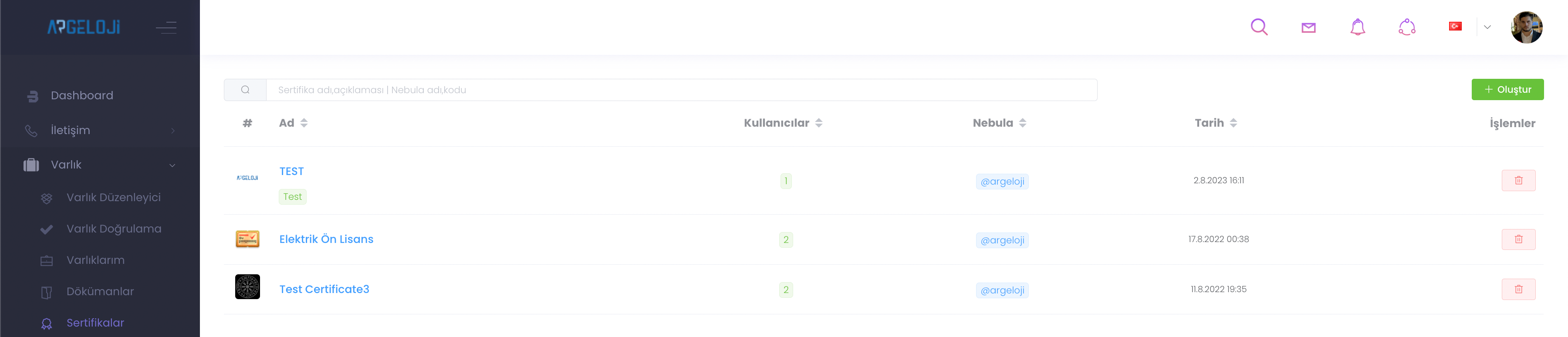 Sertifikalar kısmında bulunan bu panel tanımladığınız sertifikaların kullanıcı sayısını, oluşturulma tarihini, kısacası yönetimini sağlar.