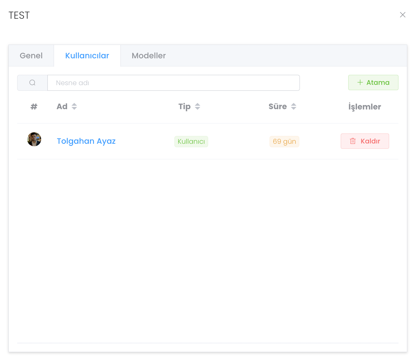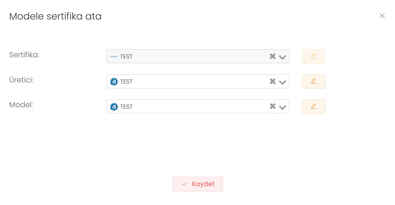 Sertifikalar kısmında mevcut sertifikaları görür ve onları düzenleyebiliyorken “Atama” butonu ile diğer modellere sertifika atayabilirsiniz.