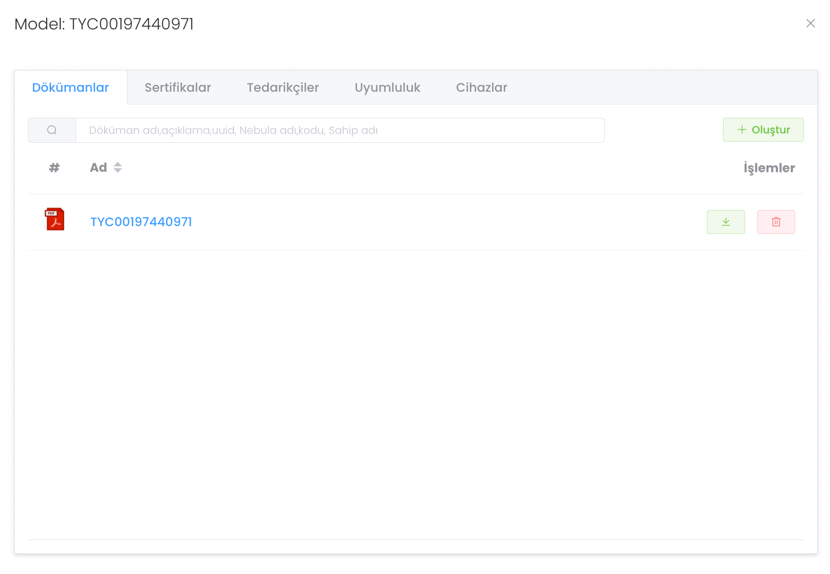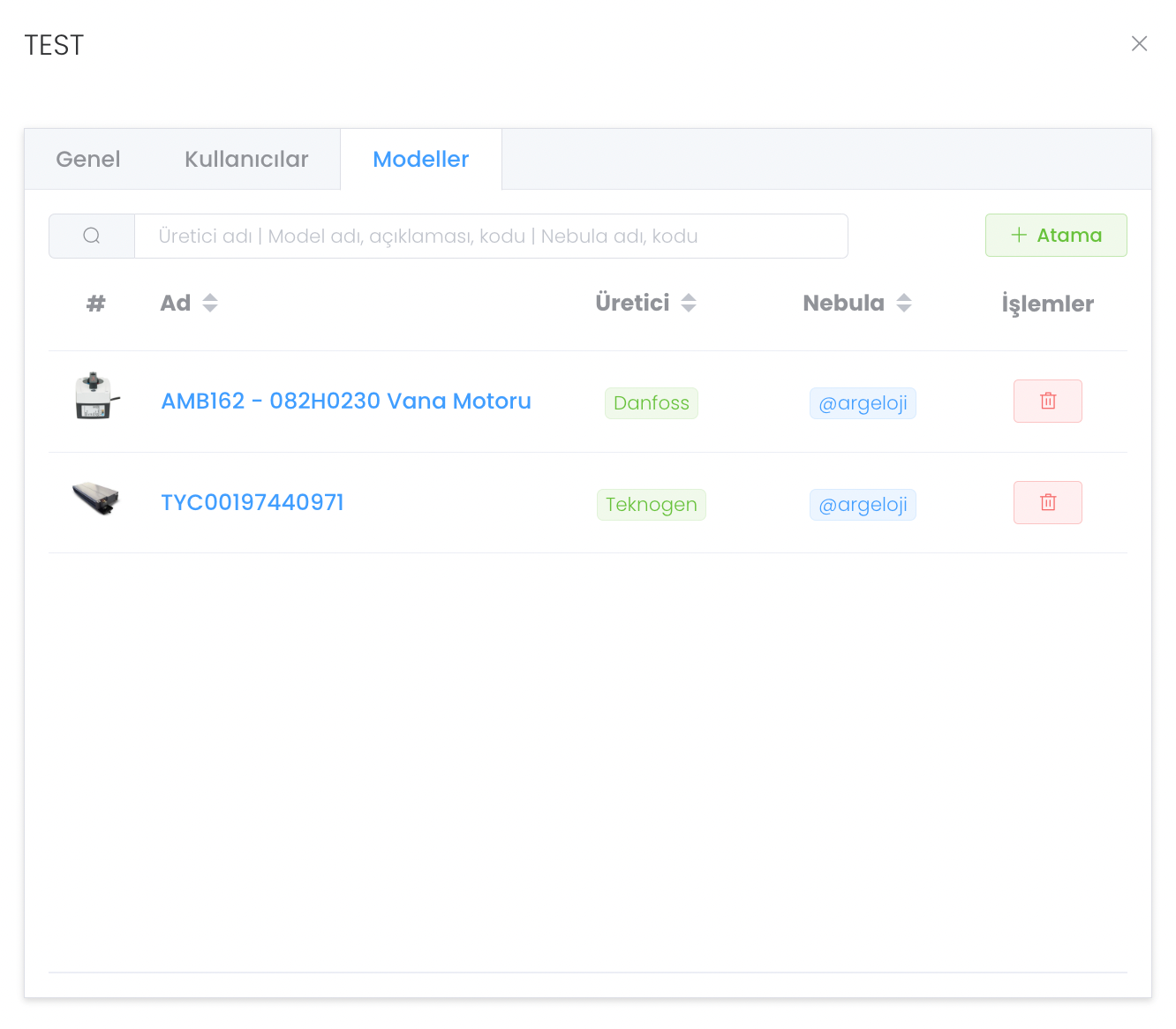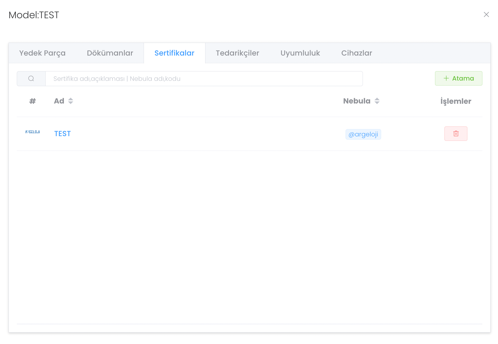 Model kısmında ürünlerin üretici ve hangi nebulada kayıtlı olduğunu görebilir “Atama” butonuna tıkladığınızda modele sertifika atayabilirsiniz.
