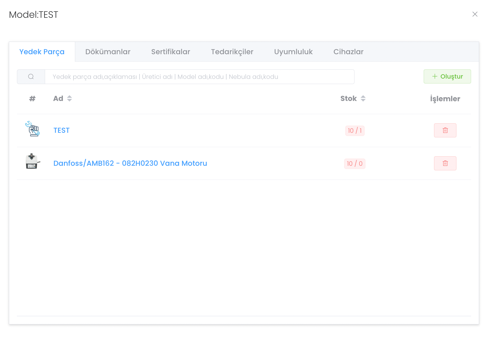 Bu kısımda yeni bir yedek parça oluşturup aynı zamanda stok durumlarını takip edebilir cihazın üstüne tıklayarak daha önceki anlatımlarımızdaki gibi yedek parçayı düzenleyebilirsiniz.