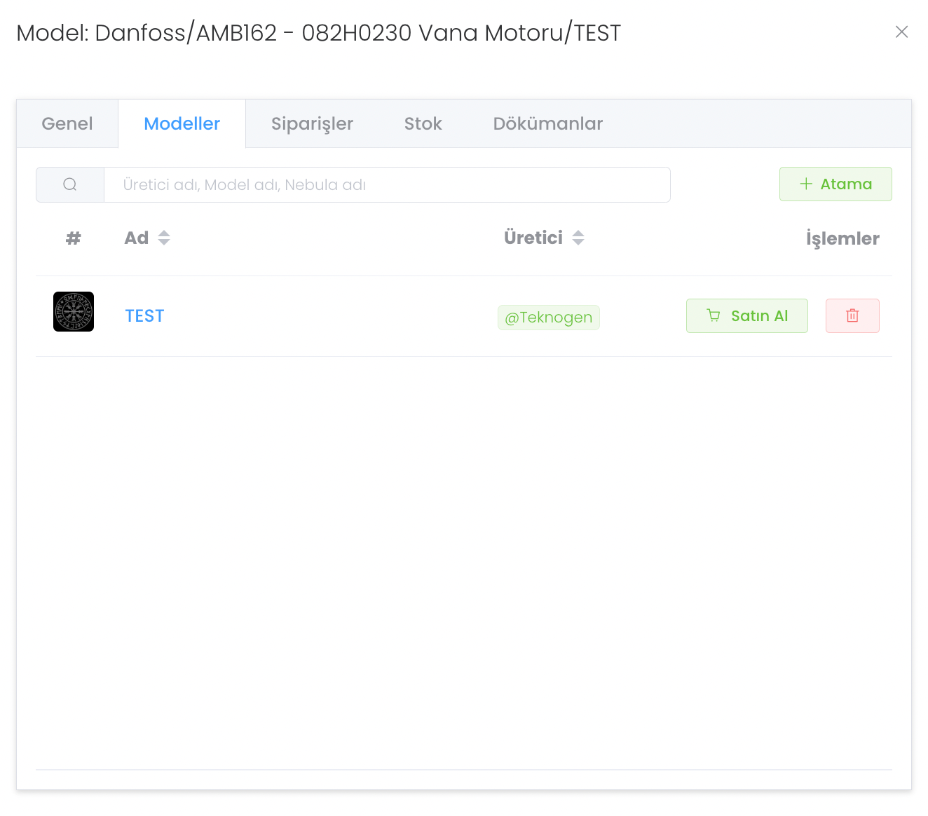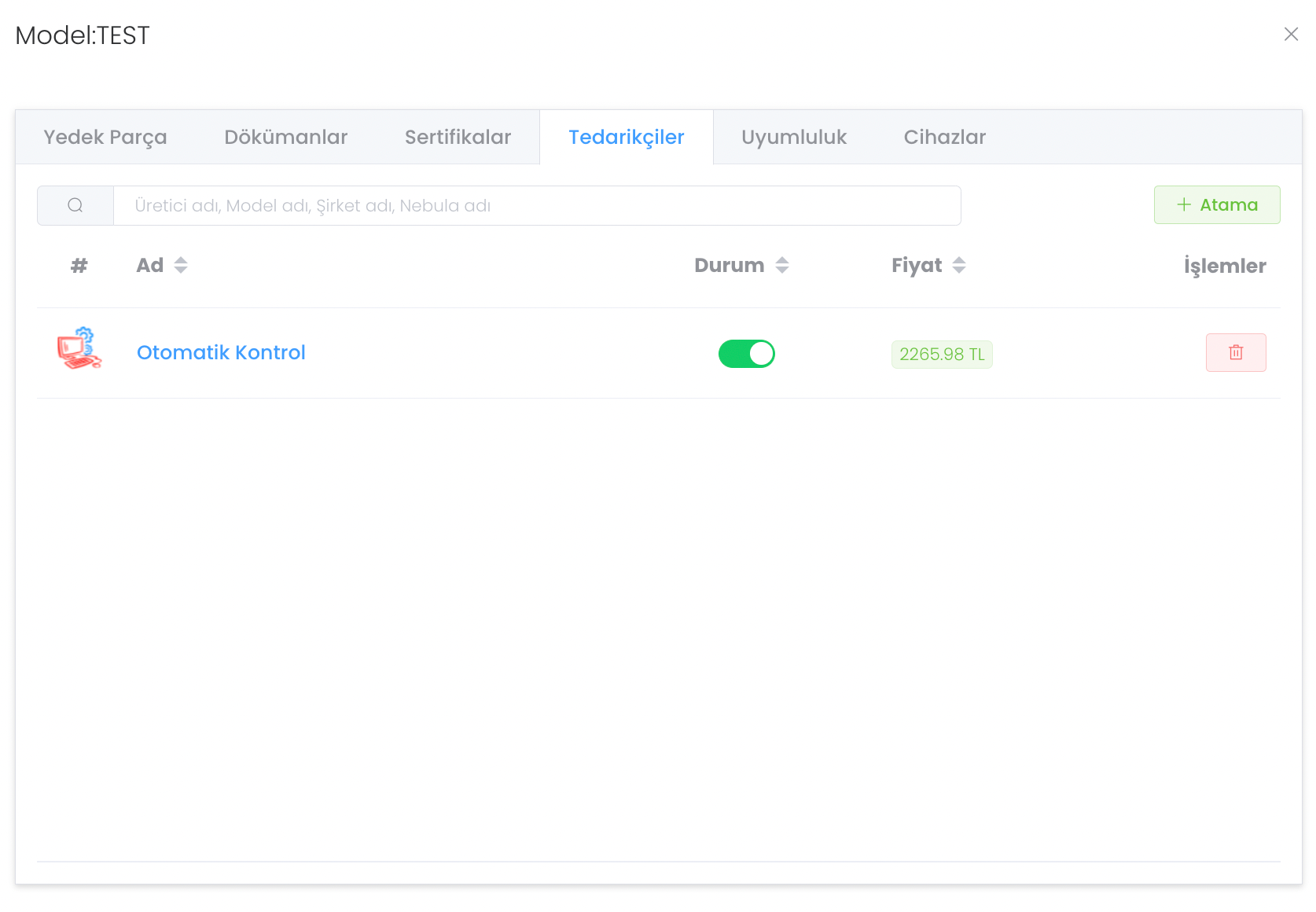 Tedarikçiler kısmında mevcut tedarikçileri görür ve onları düzenleyebilir, aktiflik durumunu değiştirebilir “Atama” butonu ile diğer modellere tedarikçi atayabilirsiniz.