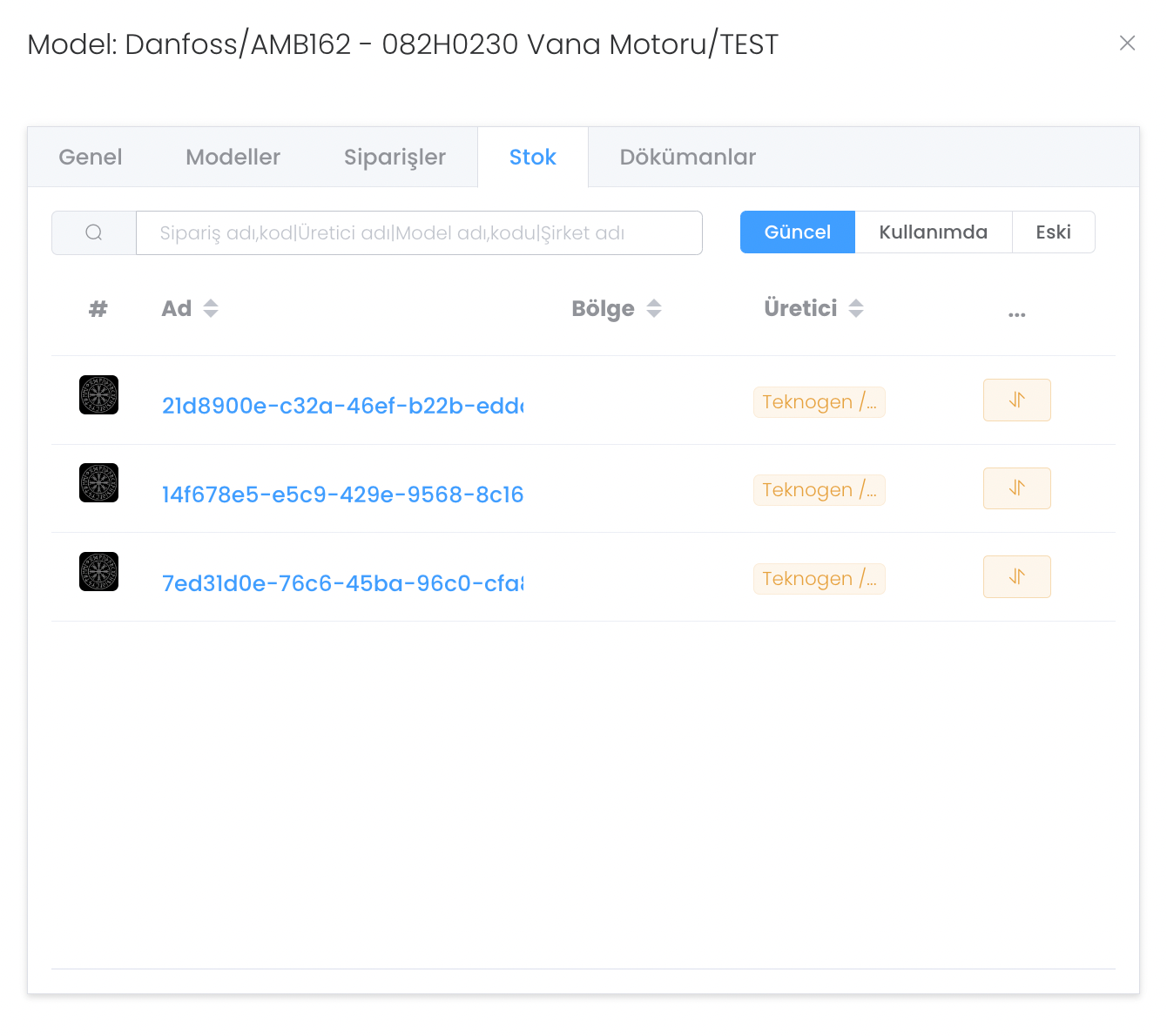 Herhangi bir modele tıkladığınızda yedek parçaların üreticisi, modeli, kullanım süresi, stok durumunu ayarlayıp düzenleyeceğiniz paneldir.