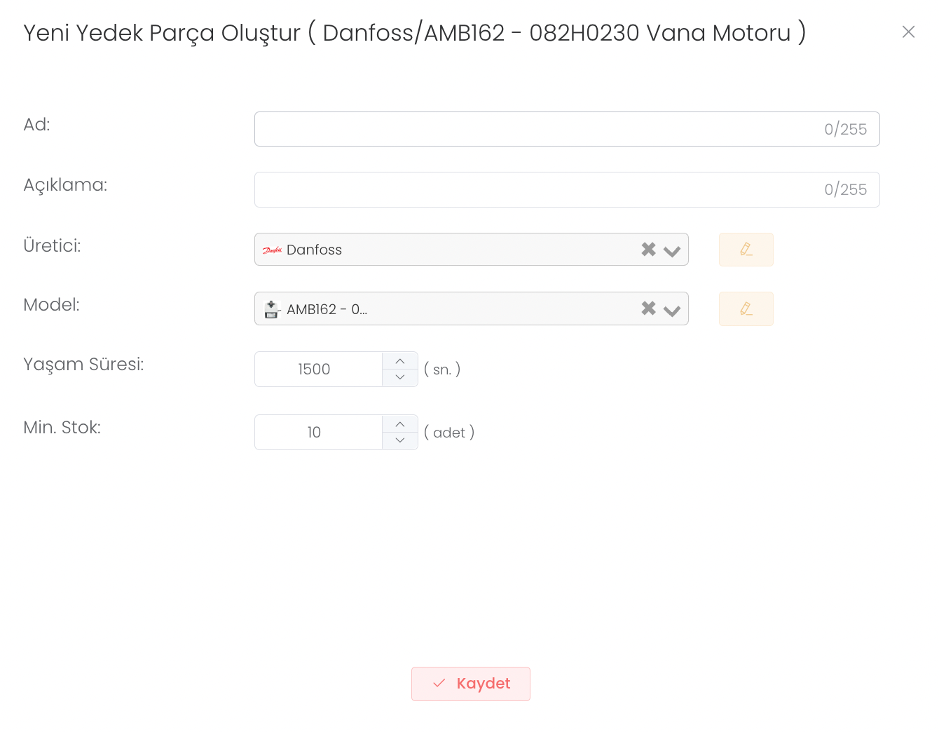 “Oluştur” butonunda bastığımızda yeni bir yedek parça oluştururuz. Üretici, model, yaşam süresi, minimum stok gibi durumları girdikten sonra “Kaydet” butonu ile parçayı aksiyona alabilirsiniz.