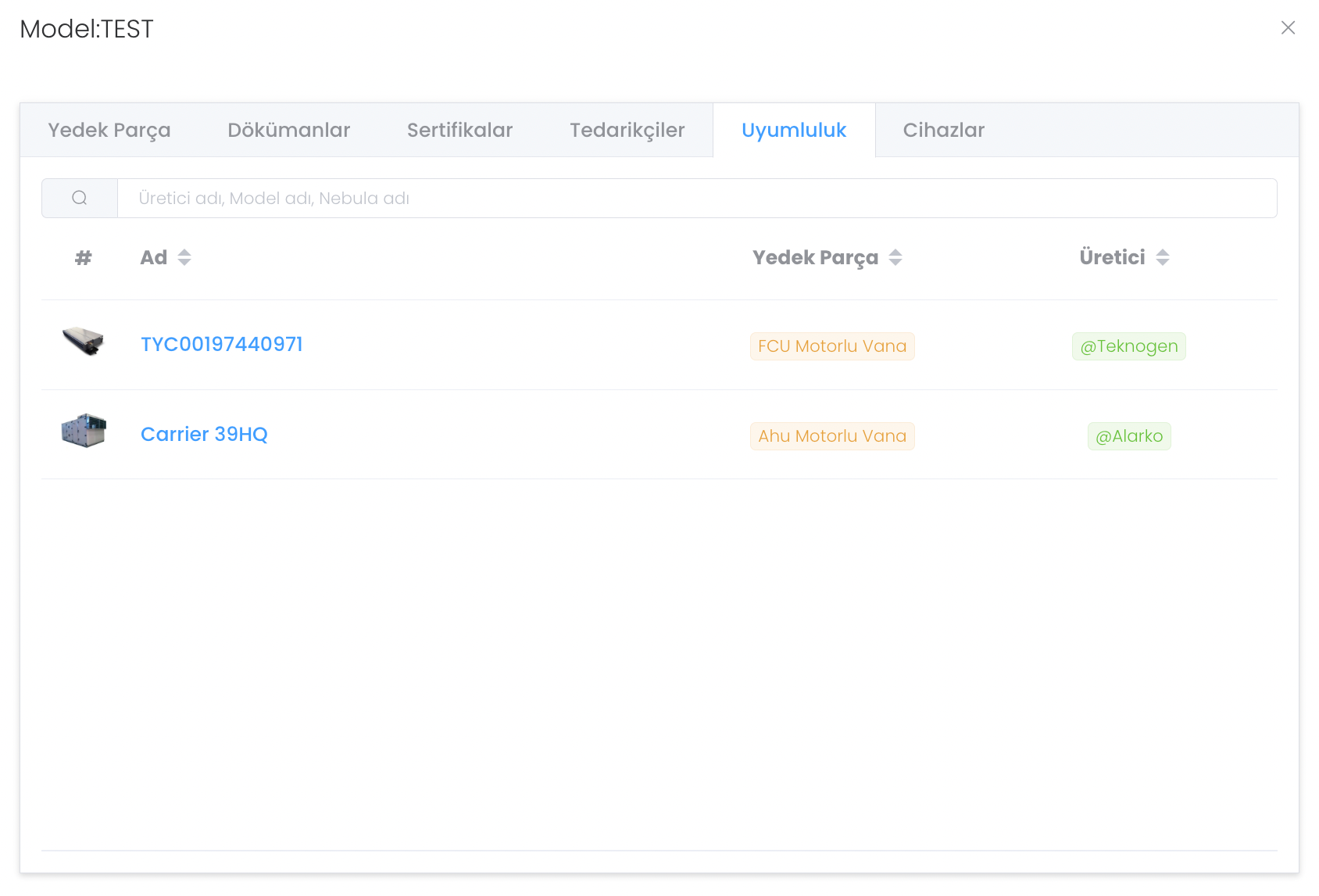 Uyumluluk bölümünden cihazların yedek parça ve üreticilerini görebilirken herhangi bir modelin üstüne tıkladığınızda ayrı bir panel açılır ve bu panelde modelin;