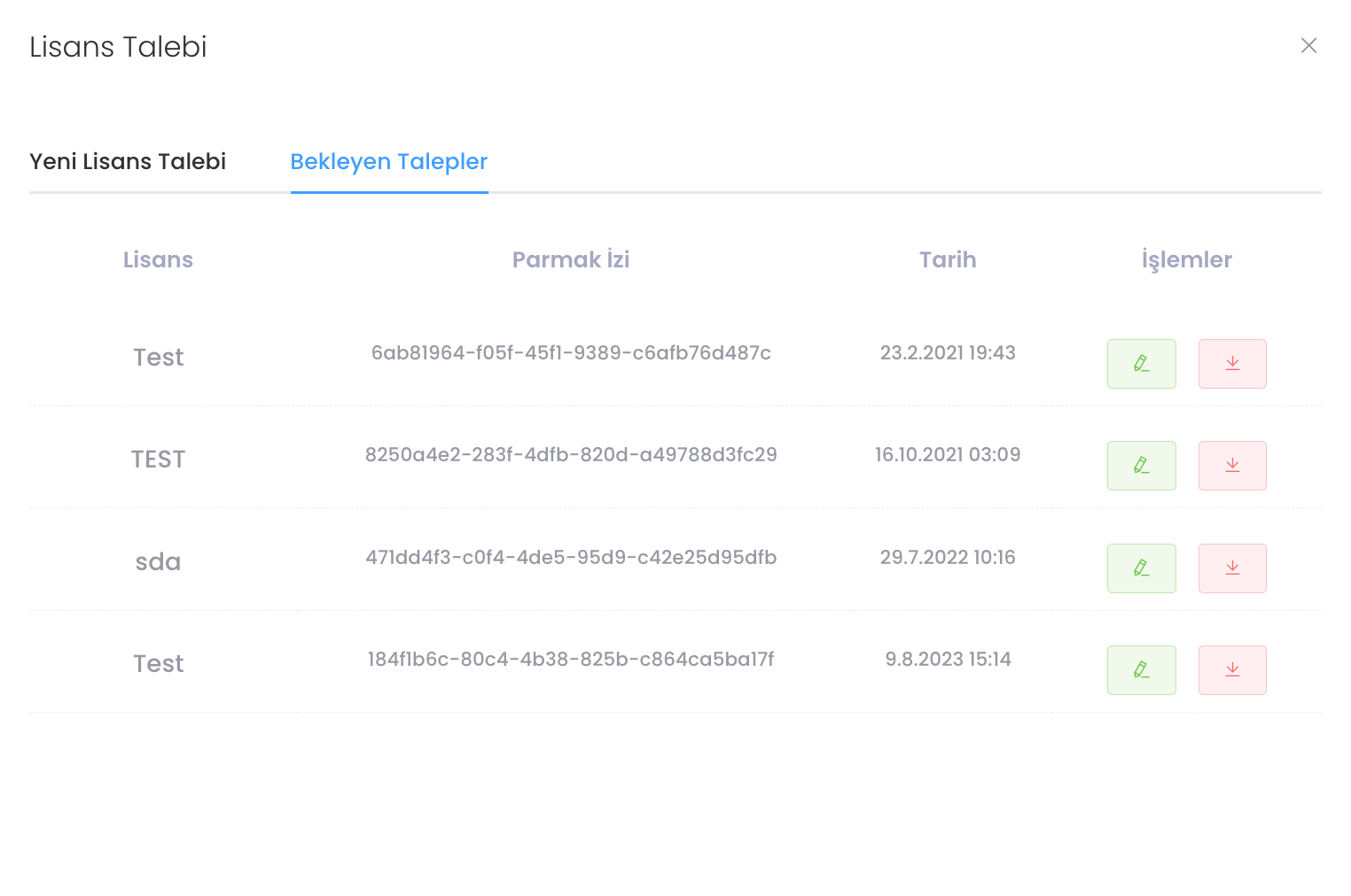 " Lisans Talebi Oluştur " butonuna tıklarsanız oluşturduğunuz lisansı bekleyen talepler bölümünde görebilir, talebi düzenleyebilir ve indirebilirsiniz.