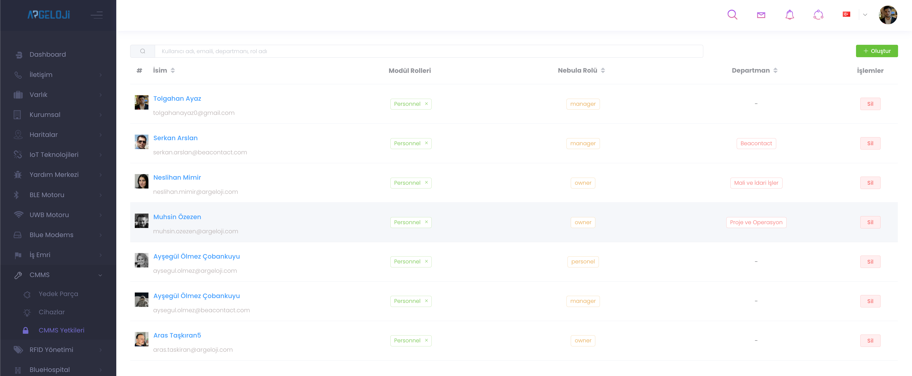 CMMS Yetkileri, parça ve cihazlara atanmış personellerin veya kullanıcıların rollerini yönettiğiniz hangi departmanda, nebula rolü gibi sorulara tek bir panel üzerinden cevap bulabileceğiniz bir yapıdır.