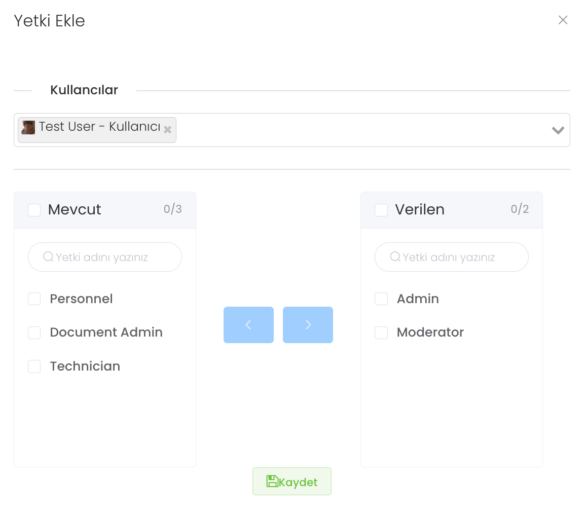 "Oluştur" butonuna tıkladıktan sonra karşınıza kullanıcı belirledikten sonra mevcut yetkilerden kullanıca vermek istediğinizi seçip verilen bölümüne mavi butonlar aracılığı ile geçişini sağlayabilirsiniz.