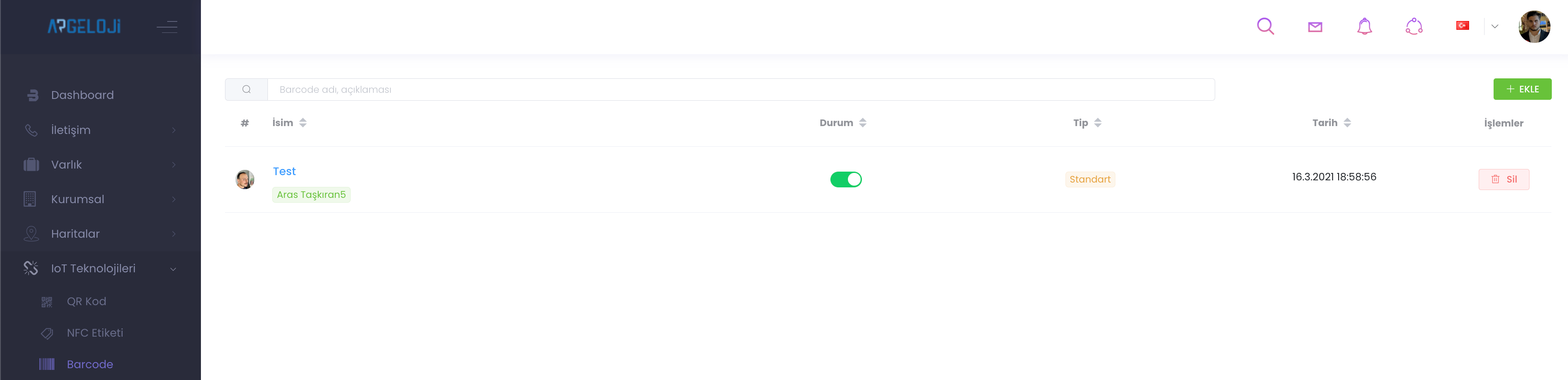 IoT Teknolojileri kategorisinde bulunan Barcode bölümünü tamamen yönettiğiniz paneldir. Bu panelde oluşturduğunuz kodun tipinden aktiflik durumuna her şeyini takip edebilirsiniz. “Ekle” butonu ile yeni bir Barcode oluşturalım.