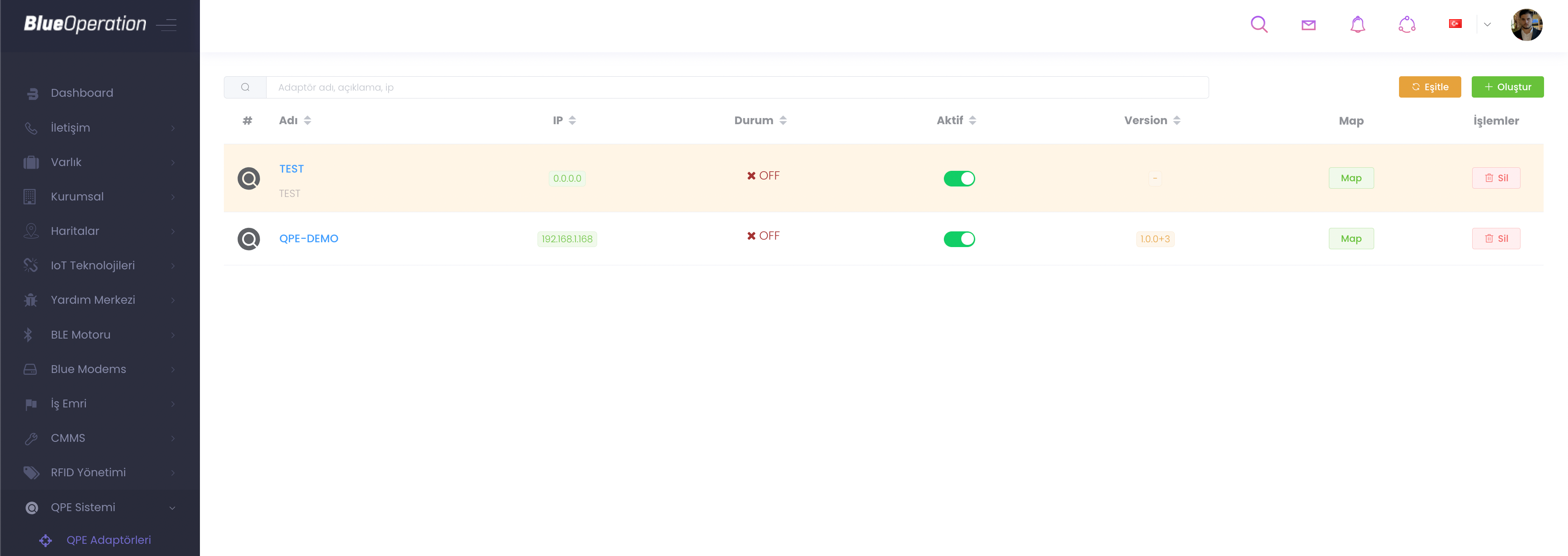 Bu yazılımın adaptör bölümünü yönetmek için kullandığımız panel "QPE Adaptörleri" panelidir. Bu panelde kayıtlı adaptörleri yönetebilir, diğer adaptörlerle eşitleyebilir ve "Oluştur" butonu ile adaptör ekleyebilirsiniz.