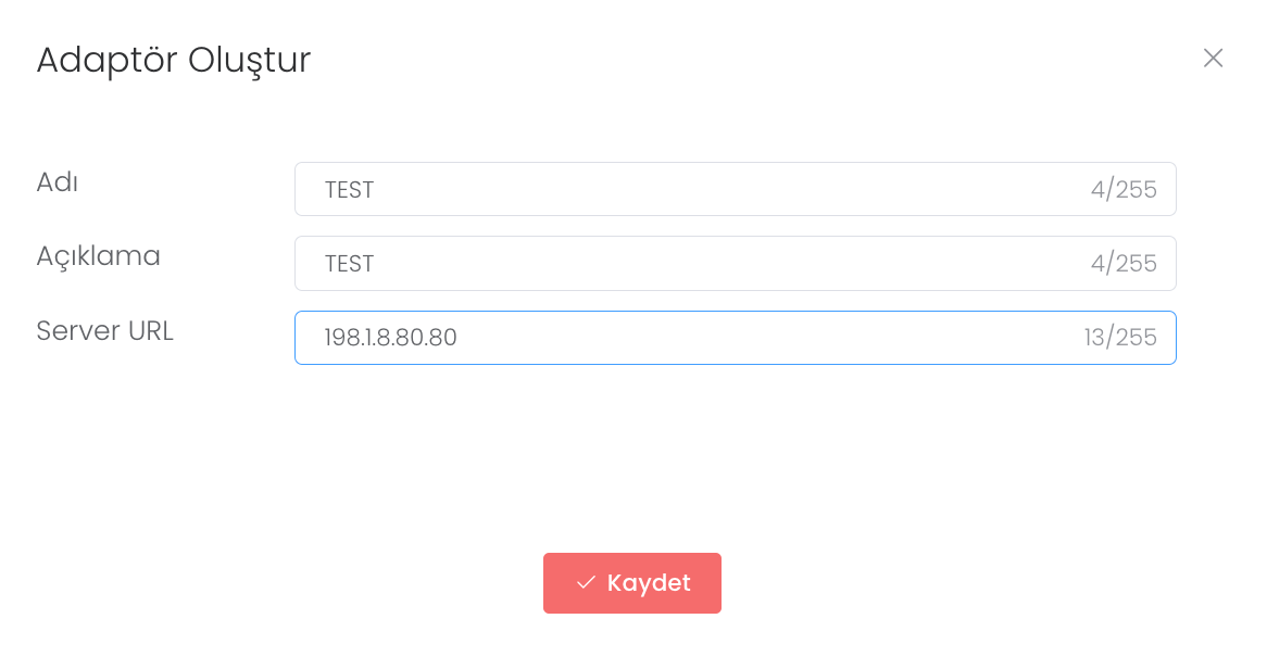 "Oluştur" butonu yeni bir adaptör oluşturmak için kullanılır. Ad, açıklama ve server urlsi girilip "Kaydet" butonuna tıklayarak yeni bir adaptör oluşturabilirsiniz.