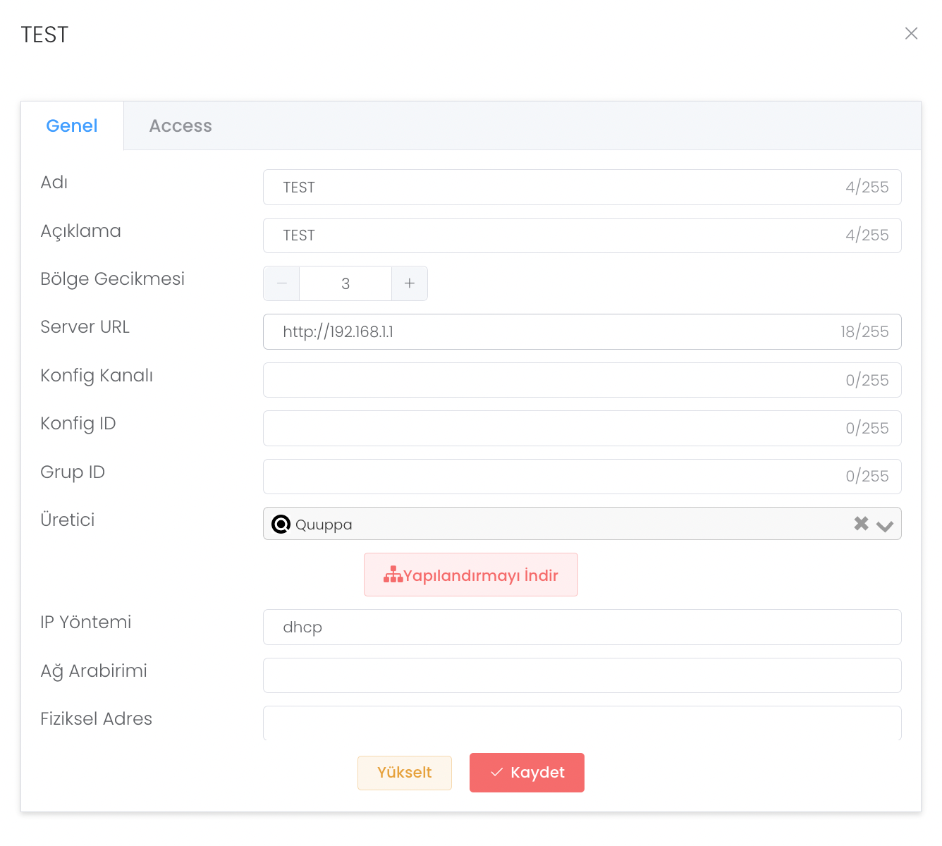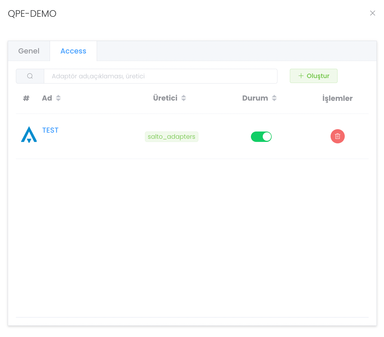 Erişim bölümü adaptöre erişebilen üreticileri yönettiğimiz veya "Oluştur" butonu ile yönetici eklediğimiz alandır.