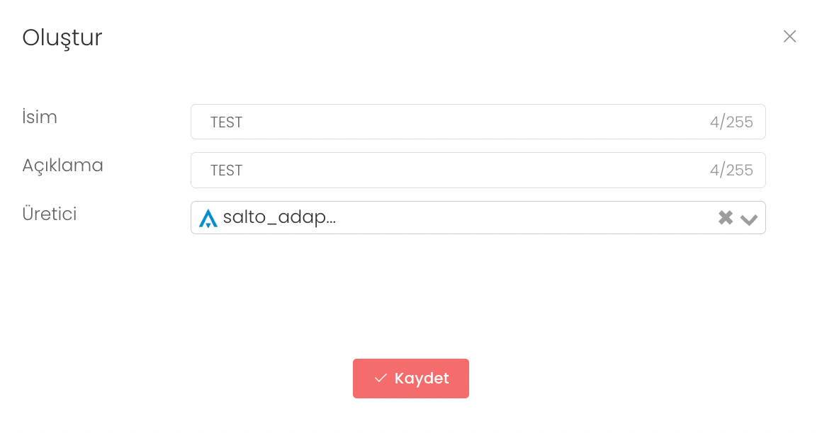 "Oluştur" butonuna tıkladıktan sonra isim, açıklama ve üretici bilgisi girip "Kaydet" butonuna tıklayarak yeni bir üretici ekleyebiliriz.