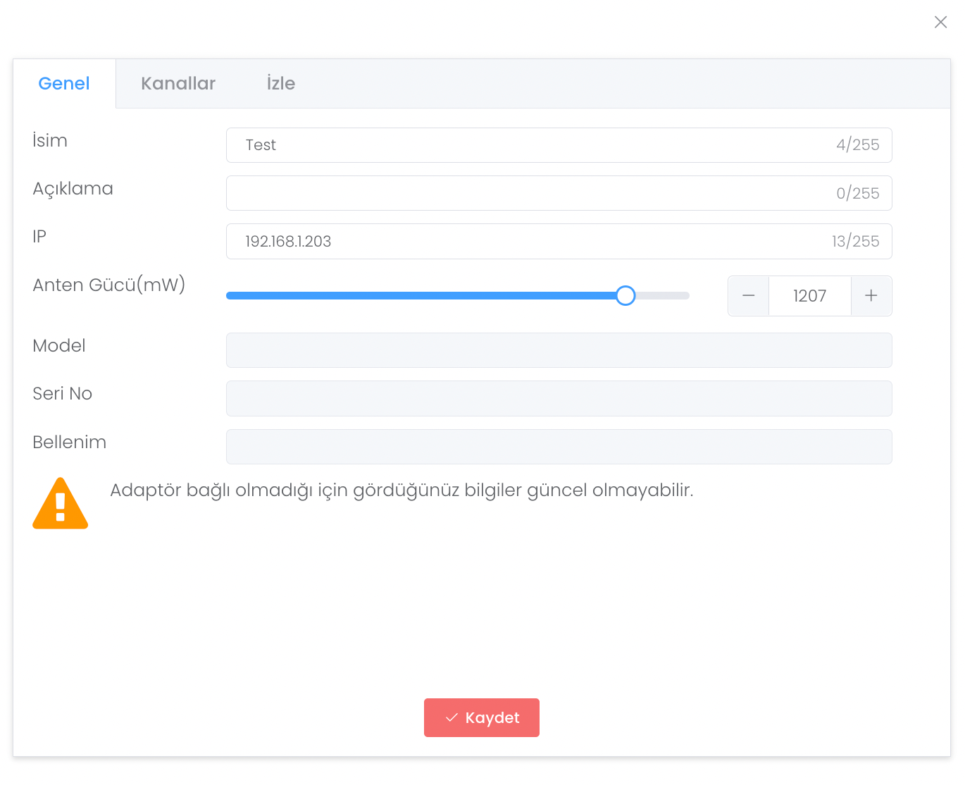 Oluşturduğunuz okuyucunun üstüne tıkladığınızda size 3 farklı alan açılır. Genel bölümünde okuyucu oluştururken girdiğiniz bilgileri düzenleyebilir adaptörün durumunu görebilirsiniz.