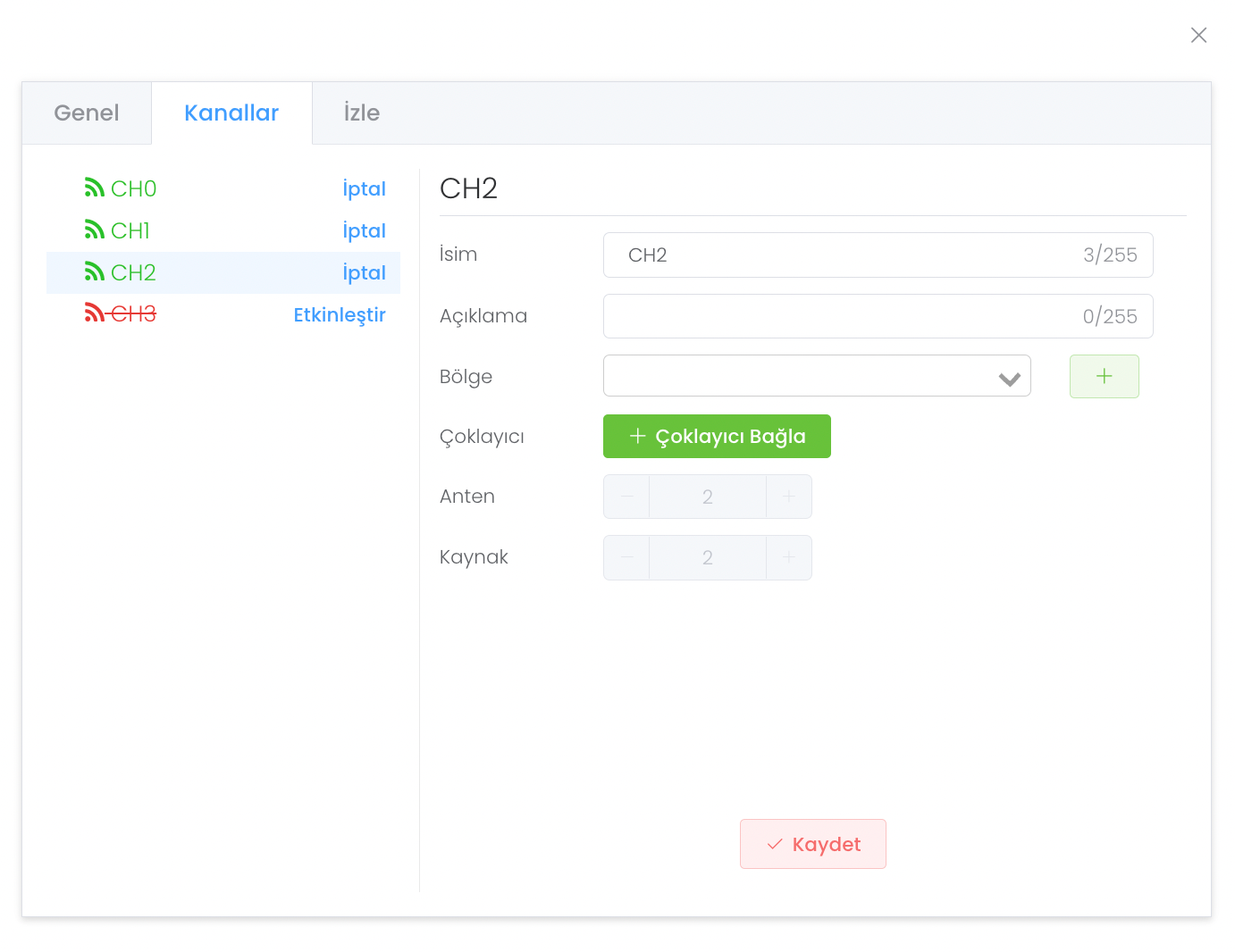 Kanallar bölümünde bağladığınız okuyucu üzerindeki kanaları görebilir, kanala bölge belirleyebilir, "Çoklayıcı Bağla" butonu ile de bir çoklayıcının altında farklı çoklayıcılar açabilirsiniz. İptal butonu ile kanalı deaktif ederken etkinleştir ile kanalı tekrar aktif edebilirsiniz.