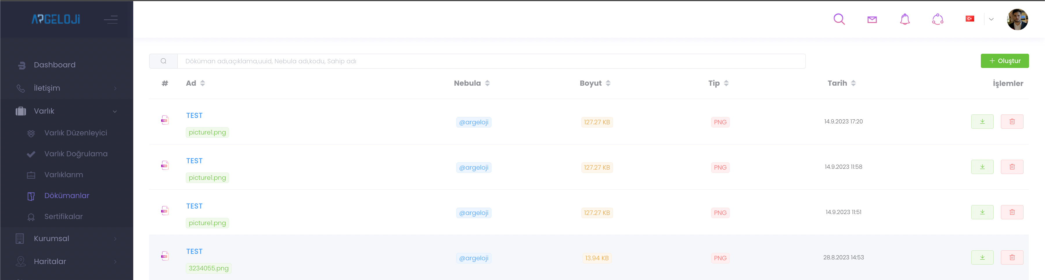 Dokümanlar bölümünden varlıklarınızda kullandığınız tüm dokümanları, belgeleri indirebileceğiniz, yönetebileceğiniz, nebulasını boyutunu, tip ve tarihini takipleyebileceğiniz bir yapı sunar.