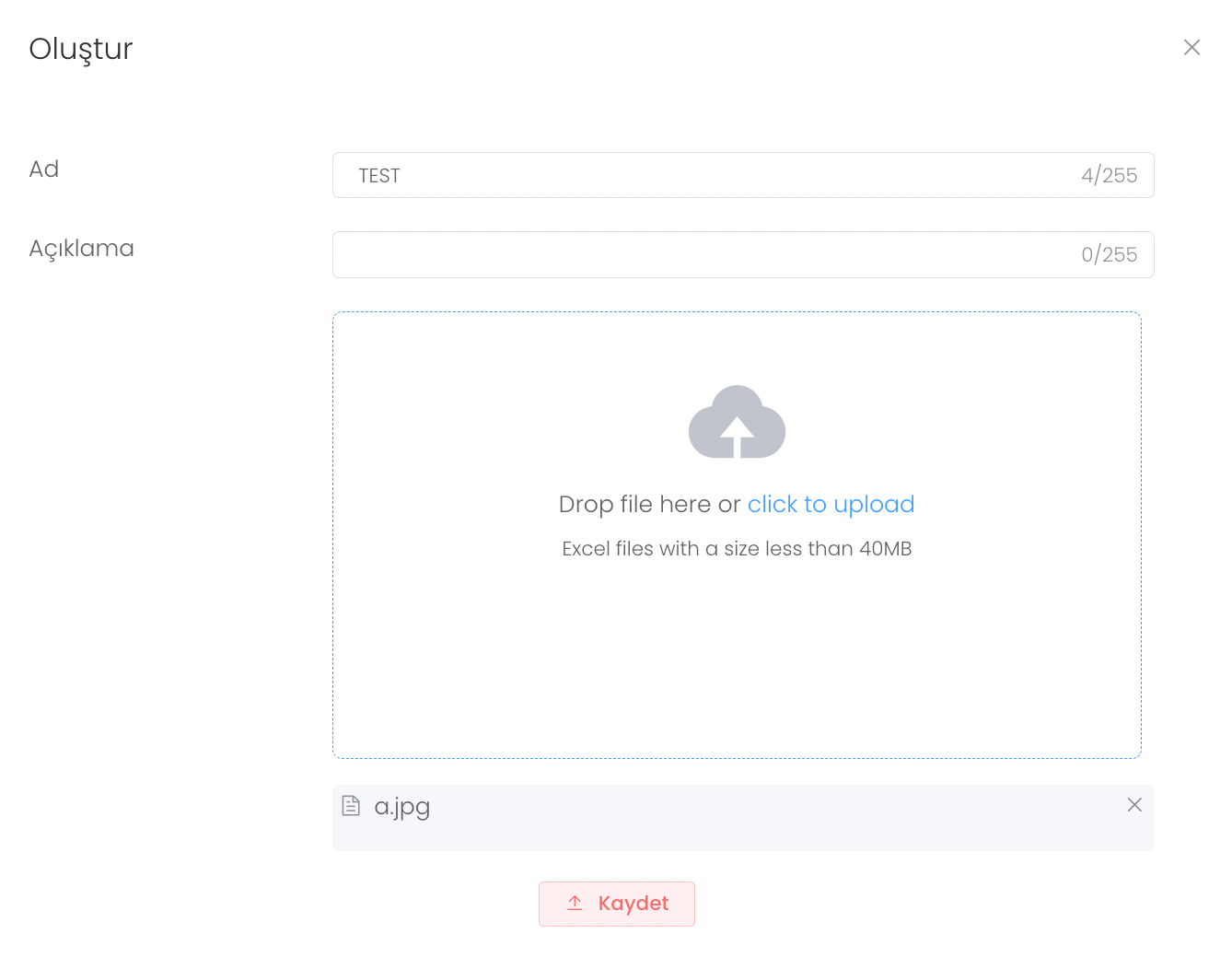 Bir belge oluşturmak için “Oluştur” butonuna tıklayarak “Ad”, “Açıklama” ve yüklemek istediğiniz dosyanızı sürükleyerek entegre edebilirsiniz.
