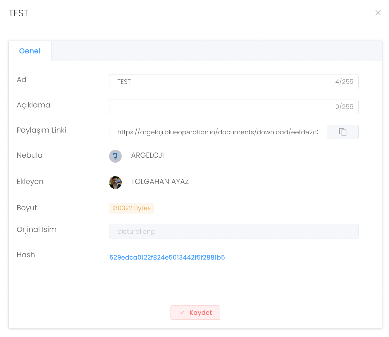 Herhangi bir belgenize tıkladığınızda paylaşma linki, ait olduğu nebulası, kimin eklediğini, boyutunu, dosya ismini, hash kodunu ve hangi nesneye ait olduğunu görüp düzenleyebileceğiniz yapıyı sunar.