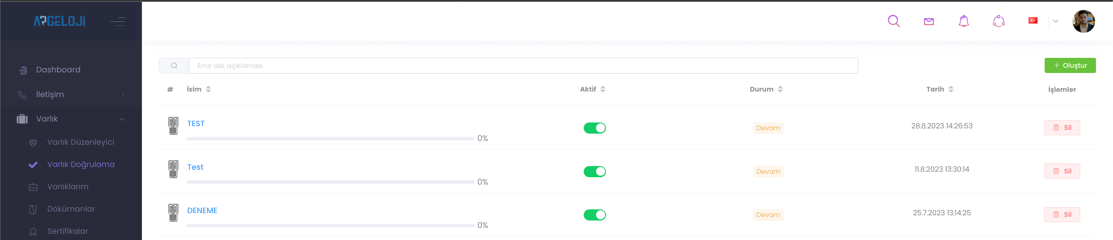 Varlık doğrulama bölümünden oluşturduğun varlıkların statüsünü görebilir aktiflik durumunu düzenleyebilirsiniz.
