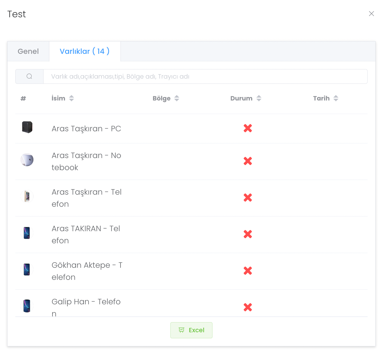 Herhangi bir varlığa tıkladığınızda ona tanımlanmış tüm cihazları ve o cihazların durumunu görebilir aşağıda bulunan “Excel” butonu ile excel formatında indirebilirsiniz.