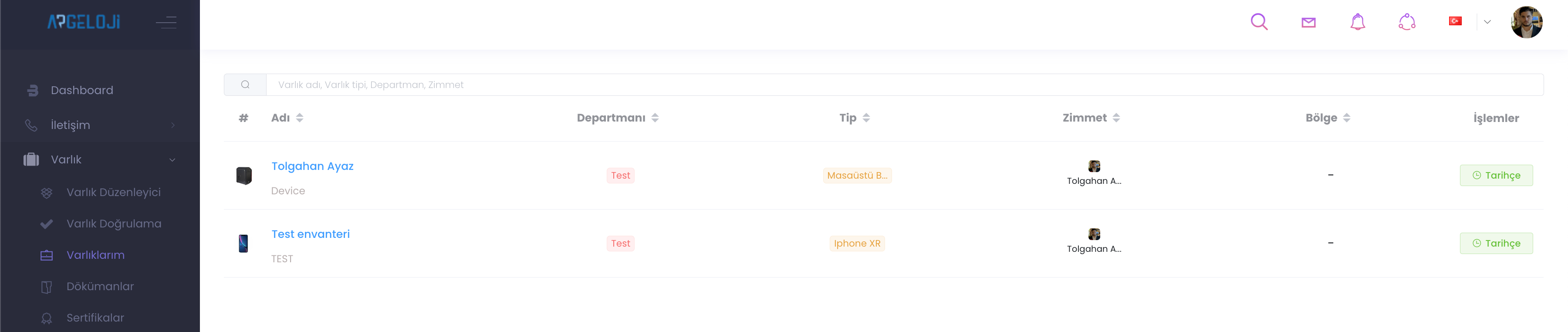 Varlıklarım kısımda işlemde olan durumlarınızı kontrol edebilir, departmanını, tipini, bölgesini ve kime zimmetli olduğunu görebilirsiniz.